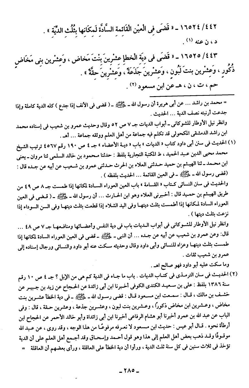 443/ 16525 - "قَضَى في دِيَةِ الْخطإِ عِشْرِينَ بِنْتَ مَخاض، وَعِشْرين بنِي مَخَاضٍ ذُكُورٍ، وَعِشْرين بنتَ لَبُونٍ، وَعِشْرينَ جَذَعَةً، وَعِشْرِينَ حِقَّةً".