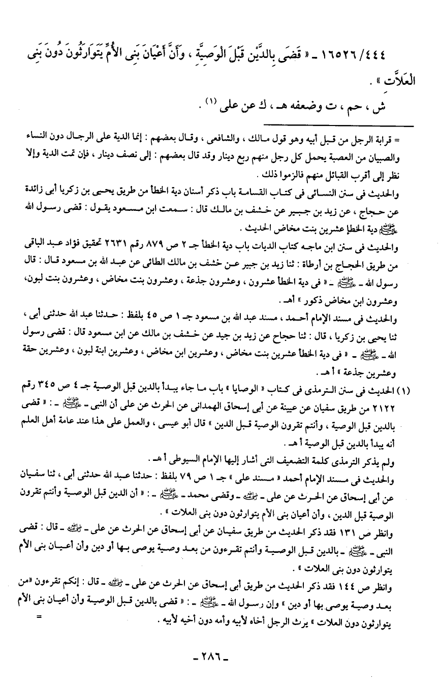 444/ 16526 - "قَضَى بِالدَّين قَبْلَ الْوَصِيَّةِ، وَأَنَّ أَعْيَانَ بَنِي الأُمِّ يَتَوَارَثُونَ دُونَ بَنِي الْعَلَّاتِ".