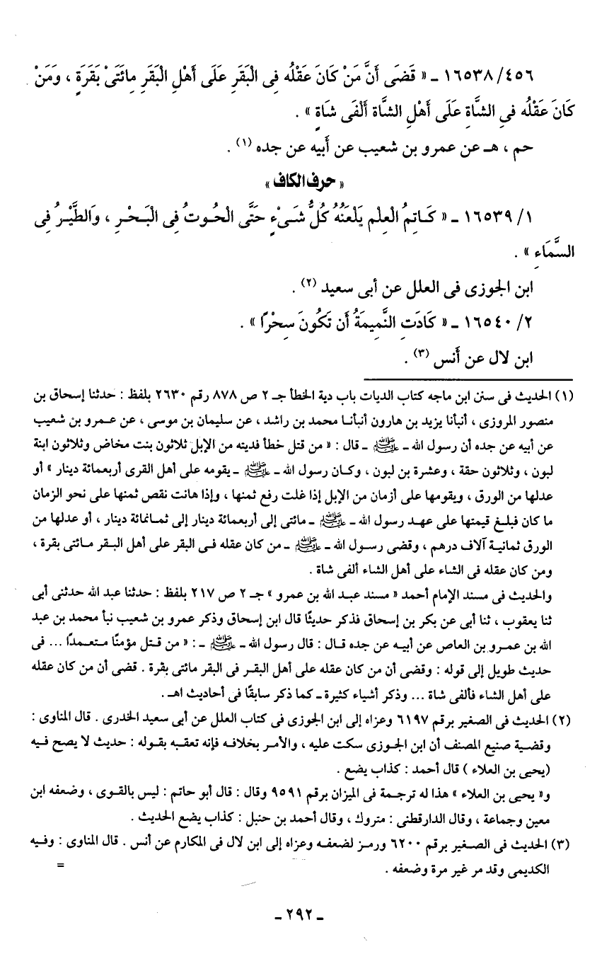 456/ 16538 - "قَضَى أن مَنْ كَانَ عَقْلُه في الْبَقَرِ عَلَى أهْلِ الْبَقَرِ مِائَتَى بَقَرَةٍ، وَمَنْ كَانَ عَقْلُه في الشَّاةِ عَلَى أهْلِ الشَّاة أَلفَى شَاةٍ".