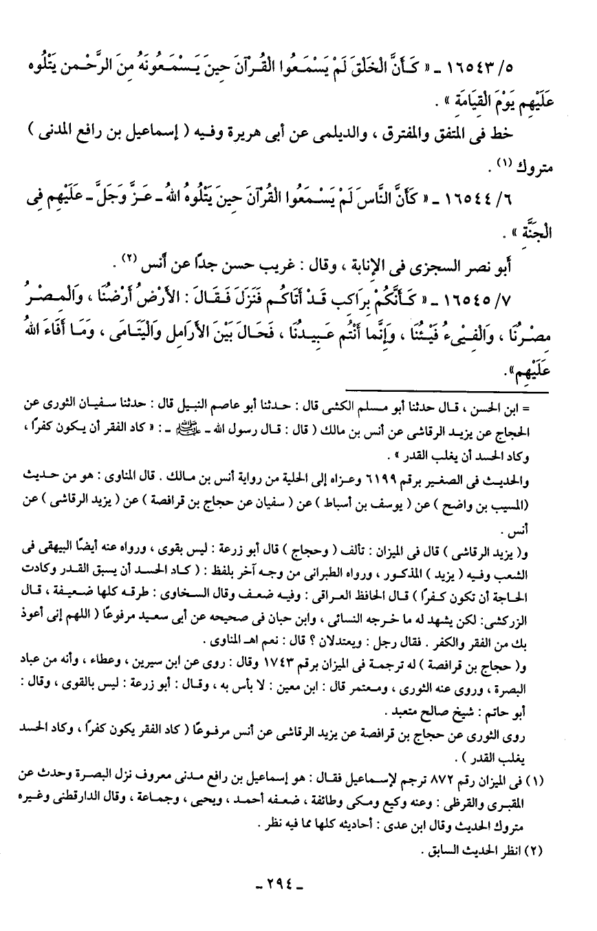= ابن الحسن، قال حدثنا أبو مسلم الكشى قال: حدثنا أبو عاصم النبيل قال: حدننا سفيان الثوري عن الحجاج عن يزيد الرقاشى عن أنس بن مالك (قال: قال رسول الله - صلى الله عليه وسلم -: "كاد الفقر أن يكون كفرًا، وكاد الحسد أن يغلب القدر".