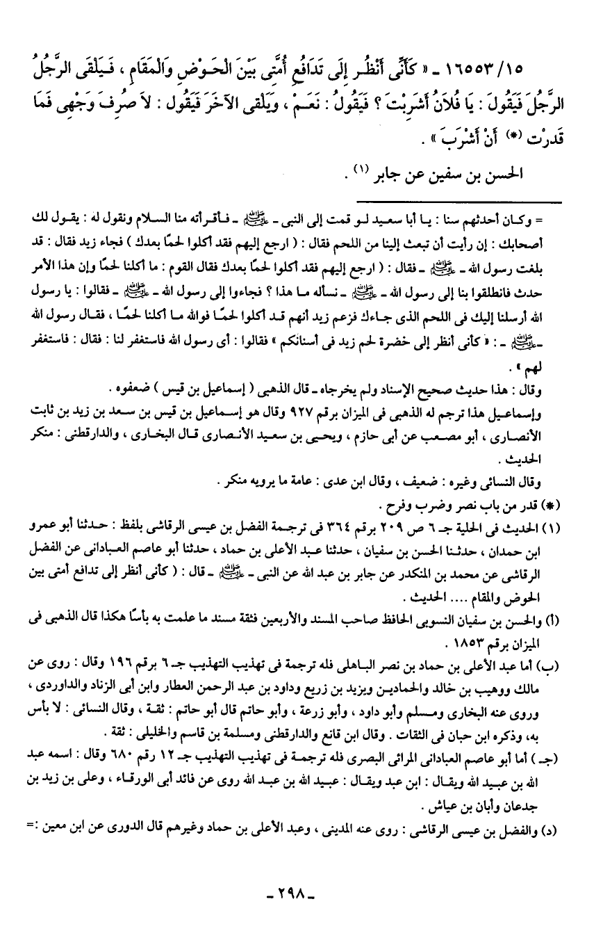 (¬1) الحديث في الحلية جـ 6 ص 209 برقم 364 في ترجمة الفضل بن عيسى الرقاشى بلفظ: حدثنا أبو عمرو بن حمدان، حدثنا الحسن بن سفيان، حدثنا عبد الأعلى بن حماد، حدثنا أبو عاصم العبادانى عن الفضل الرقاشى عن محمد بن المنكدر عن جابر بن عبد الله عن النبي - صلى الله عليه وسلم - قال: (كأني أنظر إلى تدافع أمتى بين الحوض والمقام. . . . الحديث.