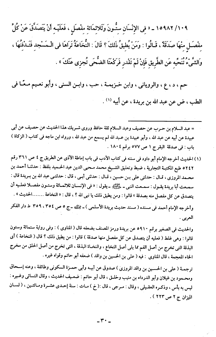(¬1) الحديث أخرجه الإمام أبو داود في سننه في كتاب الأدب في باب إماطة الأذى عن الطريق ج 4 ص 361 رقم 5242 طبع المكتبة التجارية، ضبط وتعليق الشيخ محمد محيي الدين عبد الحميد بلفظ: حدثنا أحمد بن محمد المروزى، قال: حدثني علي بن حسين، قال: حدثني أبي، قال: حدثني عبد الله بن بريدة قال: سمعت أبا بريدة يقول: سمعت النبي - صلى الله عليه وسلم - يقول: "في الإنسان ثلاثمائة وستون مفصلا فعليه أن يتصدق عن كل مفصل منه بصدقة" قالوا: ومن يطيق ذلك يا نبي الله؟ ، قال: "النخاعة. ... الحديث".
