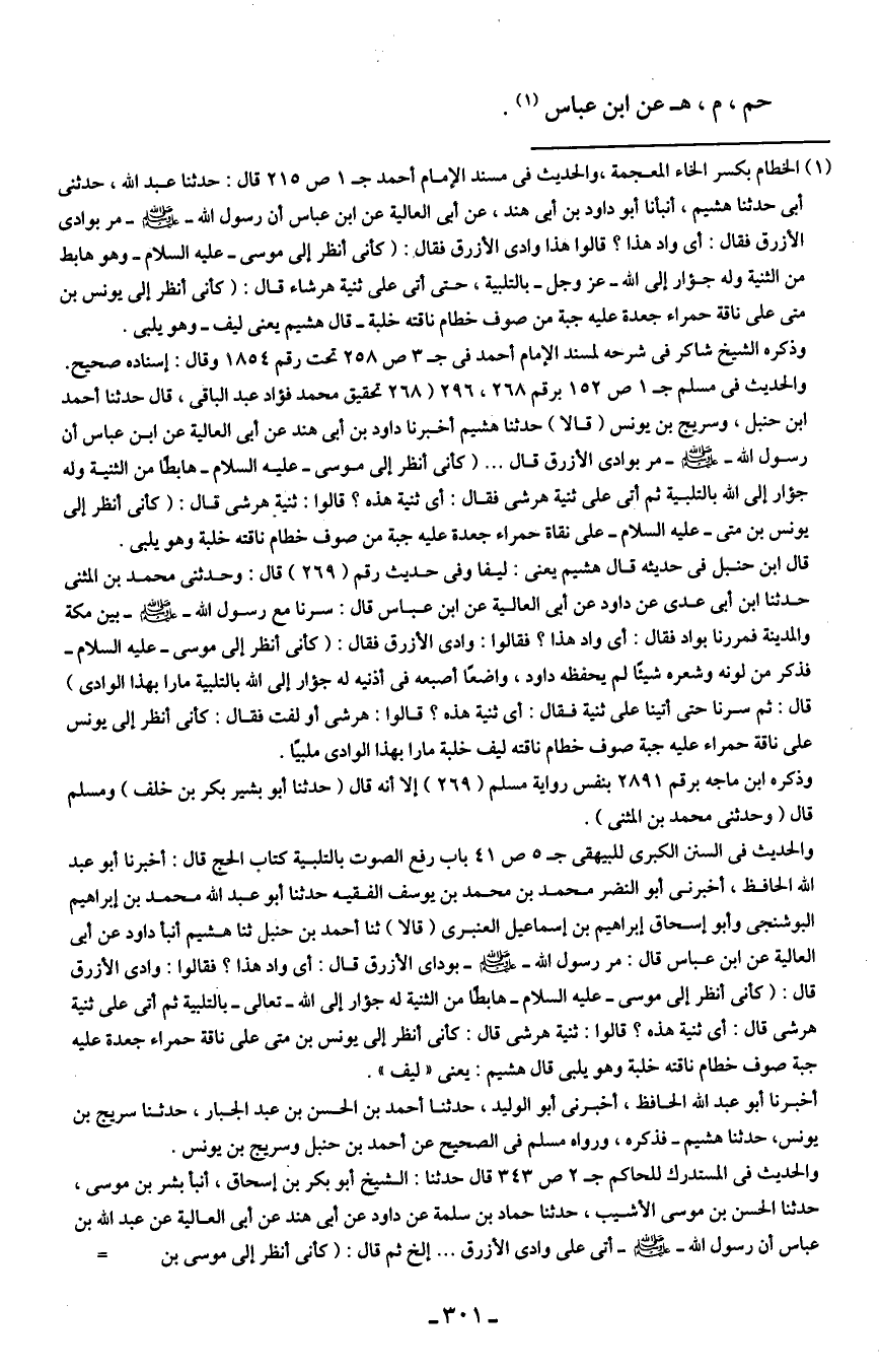 والحديث في مسلم جـ 1 ص 152 برقم 268، 269 (268 تحقيق محمد فؤاد عبد الباقي، قال حدثنا أحمد بن حنبل، وسريج بن يونس (قالا) حدثنا هشيم أخبرنا داود بن أبي هند عن أبي العالية عن ابن عباس أن رسول الله - صلى الله عليه وسلم - مر بوادى الأزرق قال. . . (كأني أنظر إلى موسى - عليه السلام - هابطًا من الثنية وله جؤار إلى الله بالتلبية ثم أتى على ثنية هرشى فقال: أي ثنية هذه؟ قالوا: ثنية هرشى قال: (كأني أنظر إلى يونس بن متى - عليه السلام - على نقاة حمراء جعدة عليه جبة من صوف خطام ناقته خلبة وهو يلبى. قال ابن حنبل في حديثه قال هشيم يعني: ليفا وفي حديث رقم (269) قال: وحدثني محمد بن المثنى حدثنا ابن أبي عدى عن داود عن أبي العالية عن ابن عباس قال: سرنا مع رسول الله - صلى الله عليه وسلم - بين مكة والمدينة فمررنا بواد فقال: أي واد هذا؟ فقالوا: وادي الأزرق فقال: (كأني أنظر إلى موسى - عليه السلام - فذكر من لونه وشعره شيئًا يحفظه داود، واضعًا أصبعه في أذنيه له جؤار إلى الله بالتلبية مارا بهذا الوادي) قال: ثم سرنا حتى أتينا على ثنية فقال: أي ثنية هذه؟ قالوا: هرشى أو لفت فقال: كأني أنظر إلى يونس على ناقة حمراء عليه جبة صوت خطام ناقته ليف خلبة مارا بهذا الوادي ملبيًا.