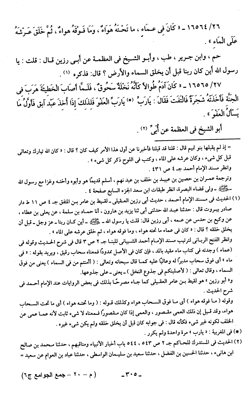 (¬1) الحديث في مسند الإمام أحمد، حديث أبي رزين العقيلي- لقيط بن عامر بن المتفق جـ 4 ص 11 ط دار صادر بيروت قال: حدثنا عبد الله حدثني أبي ثنا يزيد بن هارون، أنا حماد بن سلمة، عن يعلى بن عطاء، عن وكيع بن حدس عن عمه، أبي رزين قال: قلت يا رسول الله - صلى الله عليه وسلم - أين كان ربنا -عزَّ وجلَّ- قبل أن يخلق خلقه؟ قال: "كان في عماء ما تحته هواء، وما فوقه هواء، ثم خلق عرشه على الماء".