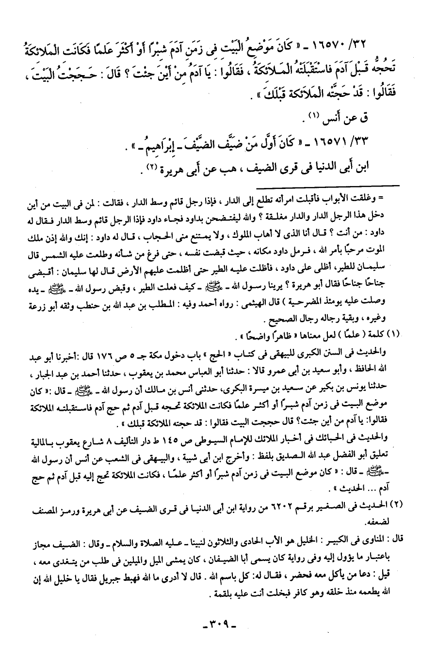 32/ 16570 - "كَانَ مَوْضِعُ الْبَيتِ في زَمَنِ آدَمَ شِبْرًا أوْ أَكْثَرَ عَلمًا فَكَانَتِ الْمَلائكَةُ تَحُجُّه قَبْلَ آدَمَ فاسْتَقْبَلَتْه الْمَلائِكَةُ، فَقَالُوا: يَا آدَمُ مِنْ أينَ جئْتَ؟ قَال: حَجَجْتُ الْبَيتَ، فَقَالُوا: قَدْ حَجَّتْه الْمَلائِكة قَبْلَكَ".