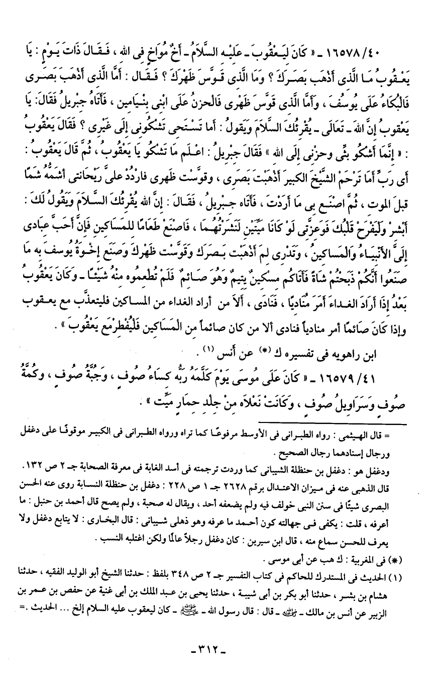 40/ 16578 - "كَانَ لِيَعْقُوبَ- عَلِيهِ السَّلامُ- أَخٌ مُوَاخٍ في الله، فَقَال ذَاتَ يَوْمٍ: يَا يَعْقُوبُ مَا الَّذِي أذهَب بَصَرَكَ؟ وَمَا الَّذِي قَوَّسَ ظَهْرَكَ؟ فَقَال: أمَّا الَّذِي أَذْهَبَ بَصرى فَالْبُكَاءُ عَلَى يُوسُفَ، وَأمَّا الَّذِي قَوَّسَ ظَهْرى فَالْحزنُ عَلَى ابْنِي بِنْيَامِين، فأتَاهُ جِبْريلُ فَقَال: يَا يَعْقوبُ إِن اللهَ -تَعَالى- يُقْرِئُكَ السَّلامَ وَيَقُولُ: أما تَسْتَحِى تَشْكُونِى إِلى غَيرِى؟ فَقَال يَعْقُوبُ: "إِنَّمَا أشكو بثِّى وحزْنِى إِلَى الله" فَقَال جِبْرِيلُ: اعْلَم مَا تَشْكُو يَا يَعْقُوبُ، ثُمَّ قَال يَعْقُوبُ: أي رَبِّ أَمَا تَرْحَمْ الشَّيخَ الكبيرَ أَذَهَبْتَ بَصَرِى، وقوَّسْت ظَهرى فارْدُدْ عليَّ رَيحَانتى أشَمُّهُ شَمًا قبلَ الموت، ثُمَّ اصْنَع بِى مَا أرْدْتَ، فَأَتَاهُ جِبْرِيلُ، فَقَال: إِن الله يُقْرِئُكَ السَّلِامَ وَيَقُولُ لَكَ: أبْشِرْ وَلْيَفْرَحْ قَلبُكَ فَوَعِزَّتِى لَوْ كَانَا ميِّتَينِ لَنَشَرْتُهُما، فَاصْنعْ طَعَامًا لِلمَسَاكِينِ فَإِنَّ أحَبَّ عِبَادى إِلَيَّ الأنْبيَاءُ وَالمَساكِينُ، وَتَدْرِى لِمَ أذهَبْت بَصَرَكَ وَقَوَّست ظَهْرَكَ وَصنَع إِخْوَةُ يُوسفَ به مَا صَنَعُوا أَنَّكُمْ ذَبَحْتُمْ شَاةً فَأَتَاكُم مِسكينٌ يِتْيمٌ وَهُوَ صَائِمٌ فَلَمْ تُطعِمُوه مِنْهُ شَيئًا- وَكَانَ يَعْقُوبُ بَعْدُ إِذَا أرَادَ الغداءَ أَمَرَ مُنَادِيًا، فَنَادَى، أَلا من أراد الغداء من المساكين فليتعذَّب مع يعقوب وإذا كَانَ صَائمًا أمر مناديًا فنادى ألا من كان صائمًا مِنْ الْمَسَاكِين فَليُفْطِرْ مَع يَعْقُوبَ".