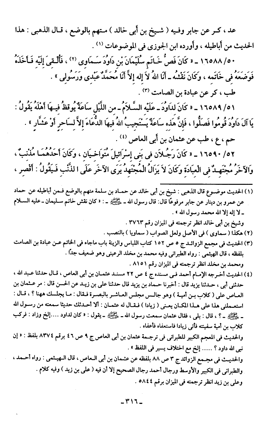 50/ 6588 - "كَانَ فَصُّ خَاتَم سُلَيمَانَ بْنِ دَاوُدَ سَمَاوى (¬2)، فَأُلقِى إِلَيهِ فَأَخَذَهُ فَوَضَعَهُ في خَاتَمِه، وَكَانَ نَقْشُه- أنَا اللهُ لَا إِله إِلَّا أنَا مُحَمَّدٌ عَبْدِي وَرَسُولِى".