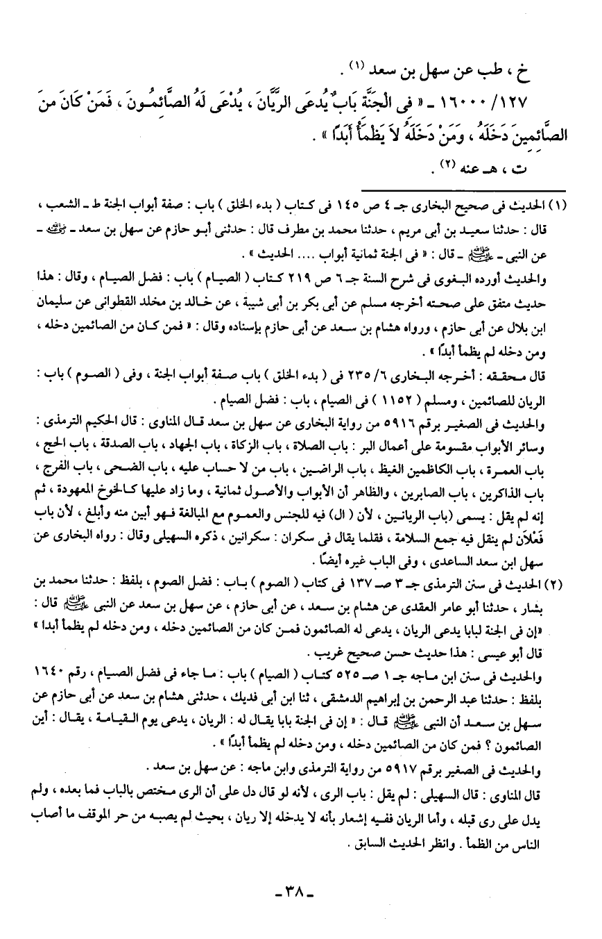 (¬1) الحديث في صحيح البخاري ج 4 ص 145 في كتاب (بدء الخلق) باب: صفة أبواب الجنة ط- الشعب، قال: حدثنا سعيد بن أبي مريم، حدثنا محمد بن مطرف قال: حدثني أبو حازم عن سهل بن سعد - رضي الله عنه - عن النبي - صلى الله عليه وسلم - قال: "في الجنة ثمانية أبواب ... الحديث".
