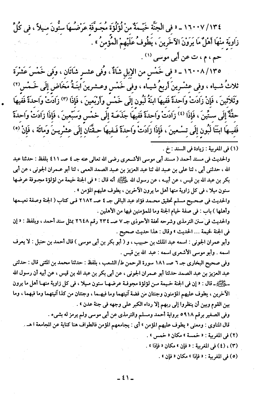 134/ 16007 - "في الْجَنَّةِ خَيْمَةٌ مِنْ لُؤْلُؤَة مُجَوَّفَةٍ عَرْضُهَا سِتُّونَ مِيلًا، في كُلِّ زَاويَةٍ مِنْهَا أهْلٌ مَا يَرَوْنَ الآخَرِينَ، يَطُوفُ عَلَيهِمْ الْمُؤمِنُ".