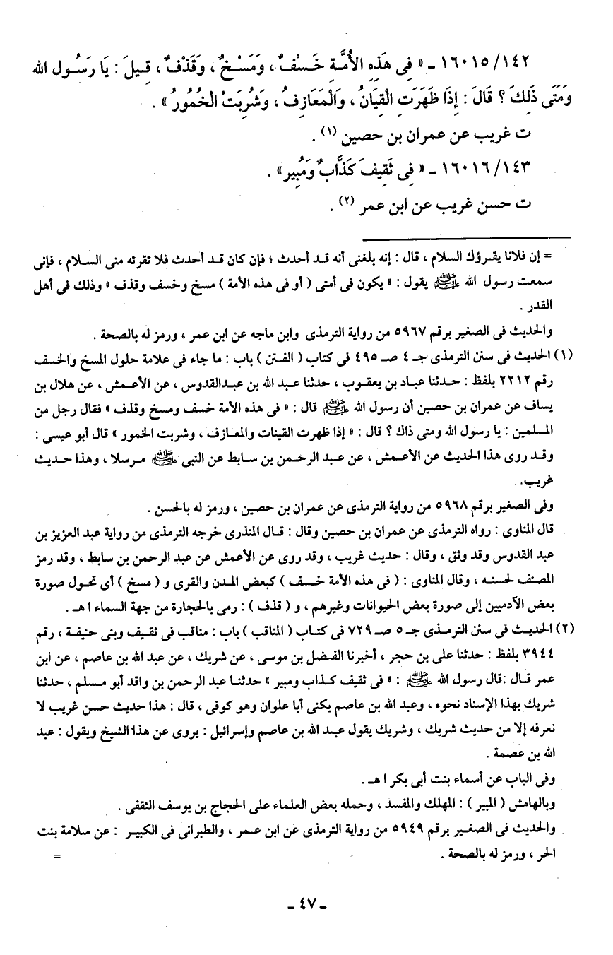 (¬1) الحديث في سنن الترمذي جـ 4 صـ 495 في كتاب (الفتن) باب: ما جاء في علامة حلول المسخ والخسف رقم 2212 بلفظ: حدثنا عباد بن يعقوب، حدثنا عبد الله بن عبد القدوس، عن الأعمش، عن هلال بن يساف عن عمران بن حصين أن رسول الله - صلى الله عليه وسلم - قال: "في هذه الأمة خسف ومسخ وقذف" فقال رجل من المسلمين: يا رسول الله ومتى ذاك؟ قال: "إذا ظهرت القينات والمعازف، وشربت الخمور" قال أبو عيسى: وقد روى هذا الحديث عن الأعمش، عن عبد الرحمن بن سابط عن النبي - صلى الله عليه وسلم - مرسلًا، وهذا حديث غريب.