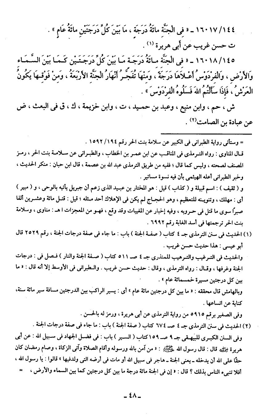144/ 16017 - "في الْجَنَّةِ مائَةُ دَرَجَةٍ، مَا بَينَ كُلِّ دَرَجَتَينِ مائَةُ عَامٍ".