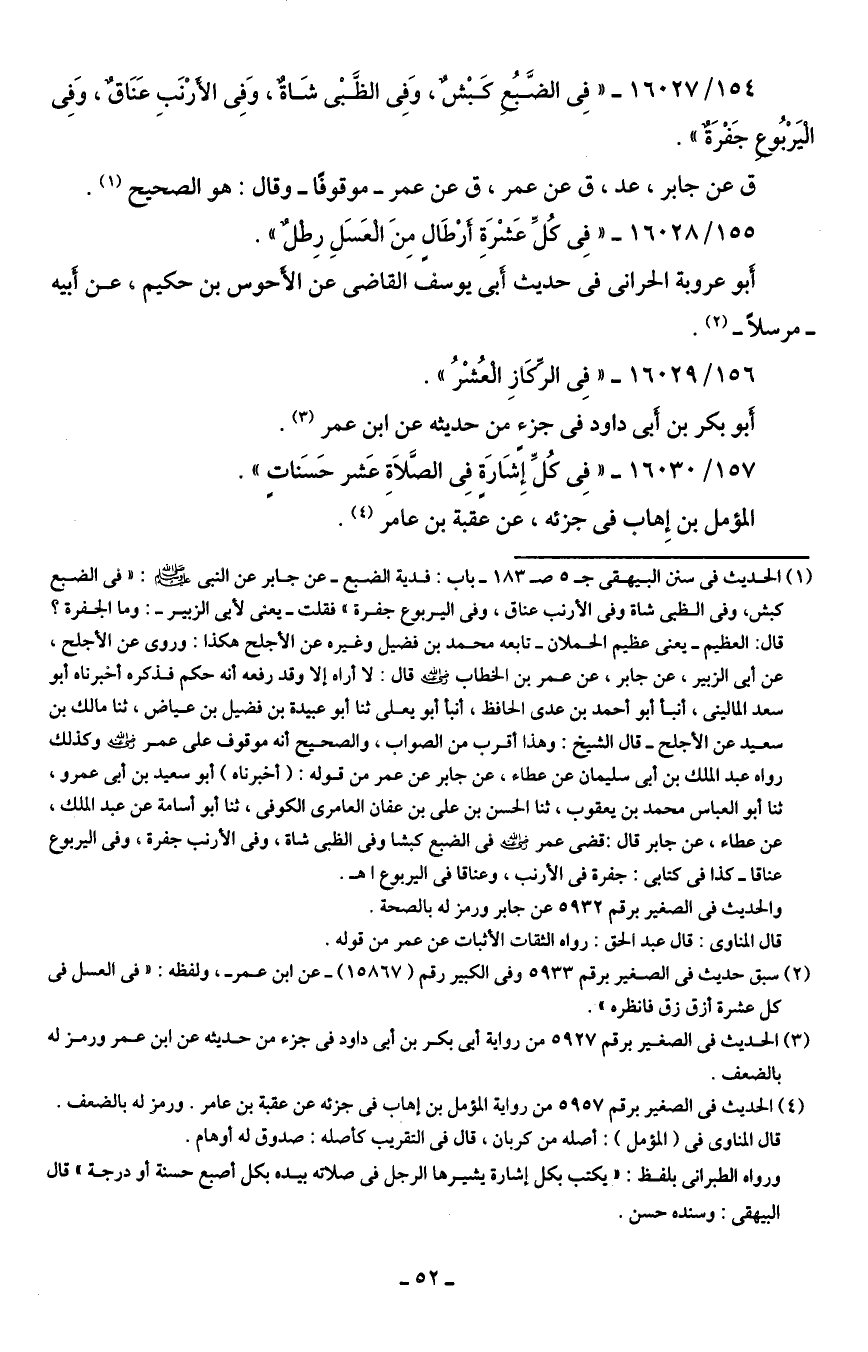 154/ 16027 - "فِي الضَّبُعِ كَبْشٌ، وَفِي الظَّبْى شَاةٌ، وَفِي الأَرْنَبِ عَنَاقٌ، وَفِي الْيَرْبُوعِ جَفْرَةٌ".
