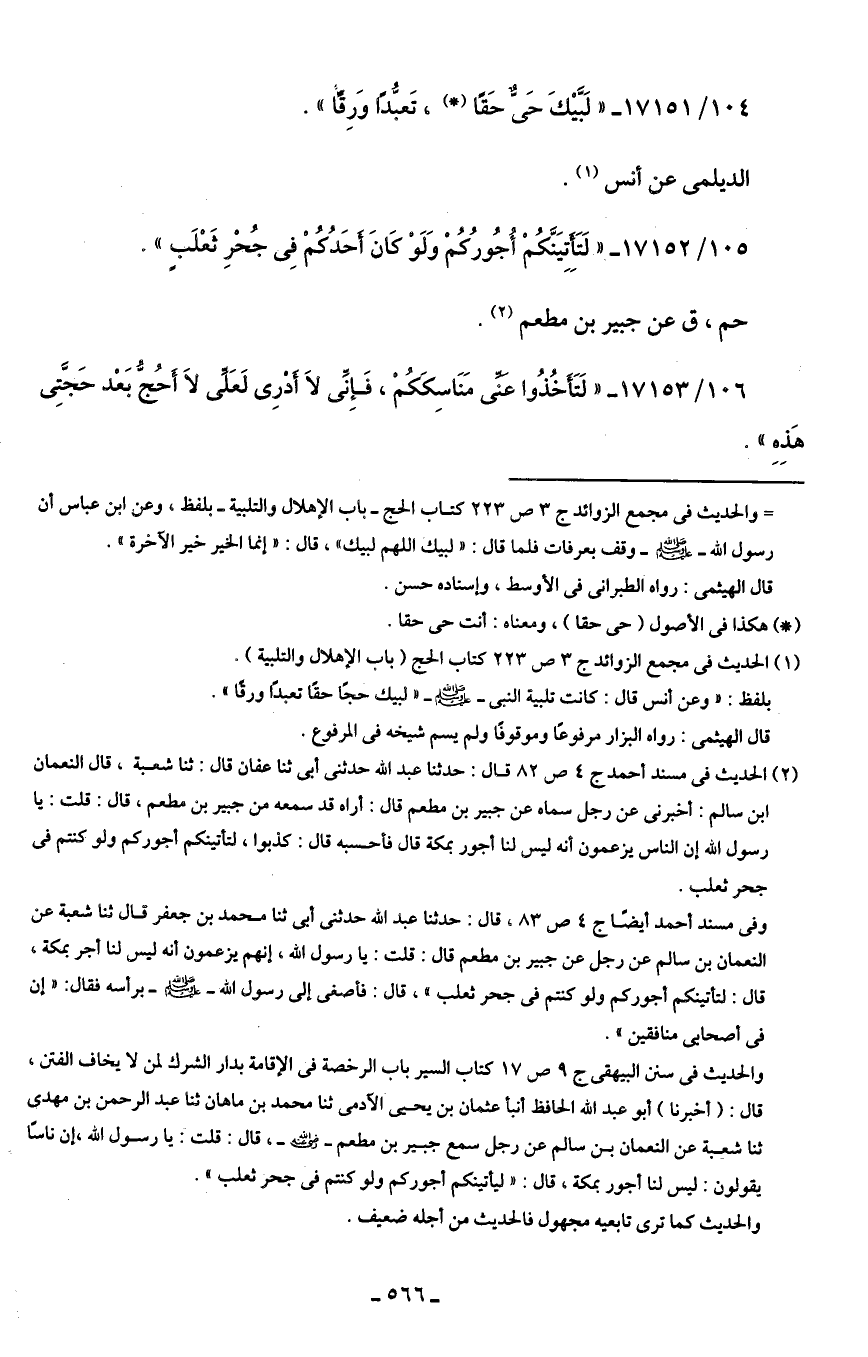 (¬2) الحديث في مسند أحمد ج 4 ص 82 قال: حدثنا عبد الله حدثني أَبى ثنا عفان قال: ثنا شعبة، قال النعمان بن سالم: أخبرني عن رجل سماه عن جبير بن مطعم قال: أراه قد سمعه من جبير بن مطعم، قال: قلت: يا رسول الله - صلى الله عليه وسلم - إن الناس يزعمون أنه ليس لنا أجور بمكة قال فأحسبه قال: كذبوا، لتأتينكم أجوركم ولو كنتم في جحر ثعلب.