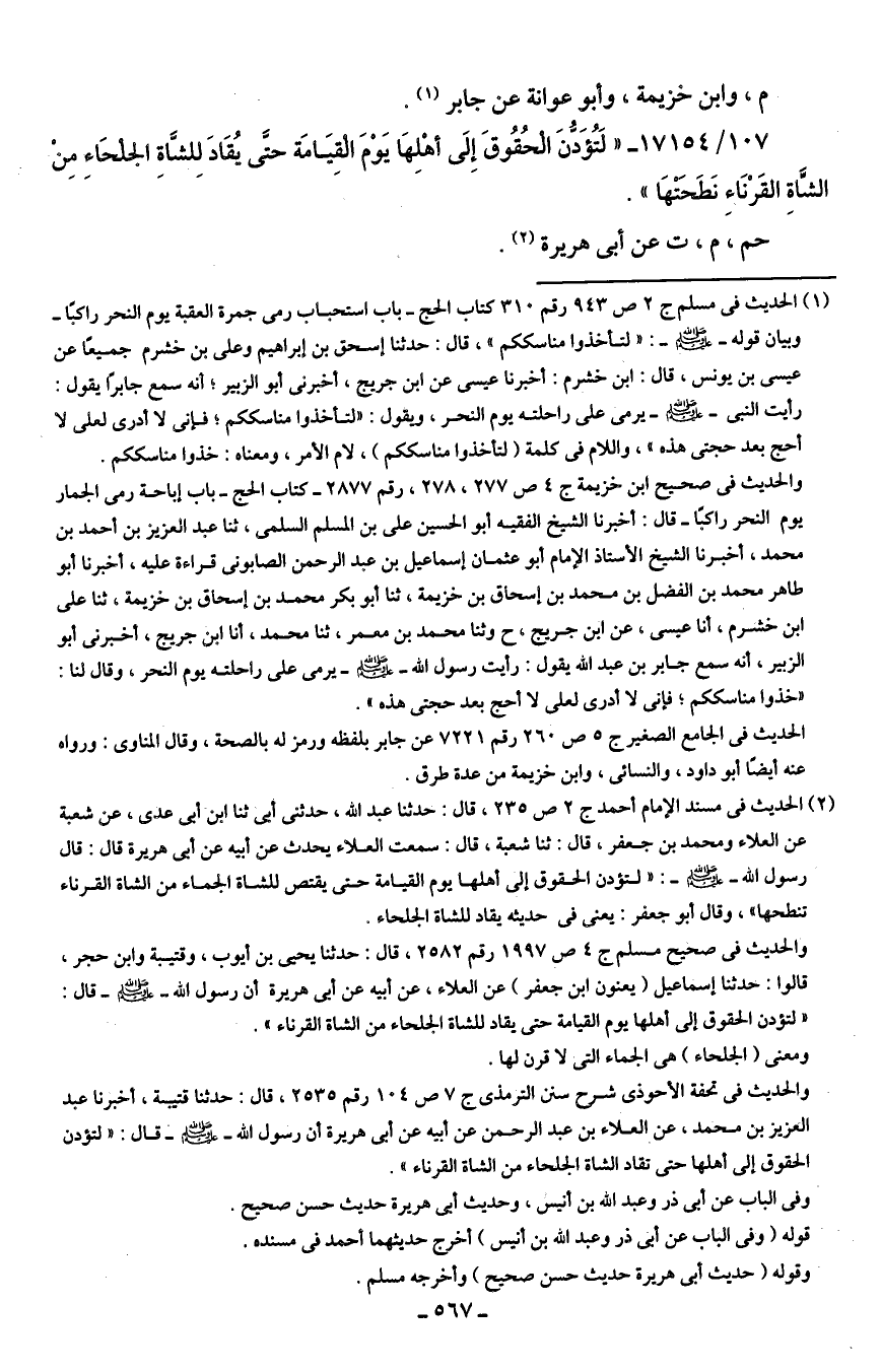 107/ 17154 - "لَتُؤَدُّنَ الحُقُوقَ إِلَى أهْلهَا يَوْمَ القيَامَة حتَّى يُقَادَ للشَّاة الجلحَاء منْ الشَّاةِ القَرْنَاءِ نَطَحتهَا".
