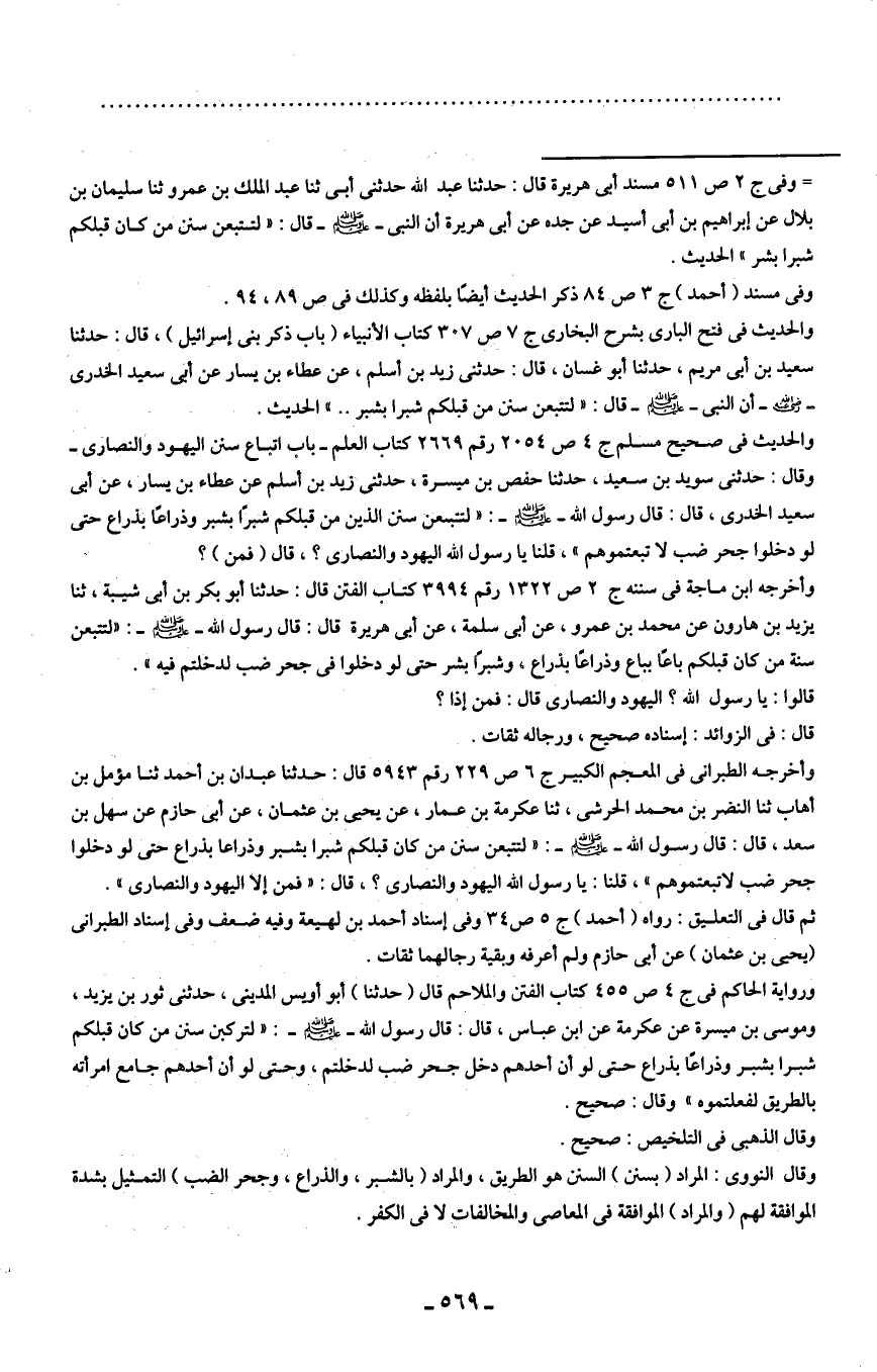 والحديث في صحيح مسلم ج 4 ص 2054 رقم 2669 كتاب العلم- باب اتباع سنن اليهود والنصارى- وقال: حدثني سويد بن سعيد، حدثنا حفص بن ميسرة، حدثني زيد بن أسلم عن عطاء بن يسار، عن أبي سعيد الخدري، قال: قال رسول الله - صلى الله عليه وسلم -: "لتتبعن سنن الذين من قبلكم شبرًا بشبر وذراعًا بذراع حتى لو دخلوا جحر ضب لاتبعتموهم"، قلنا يا رسول الله - صلى الله عليه وسلم - اليهود والنصارى؟ ، قال (فمن)؟