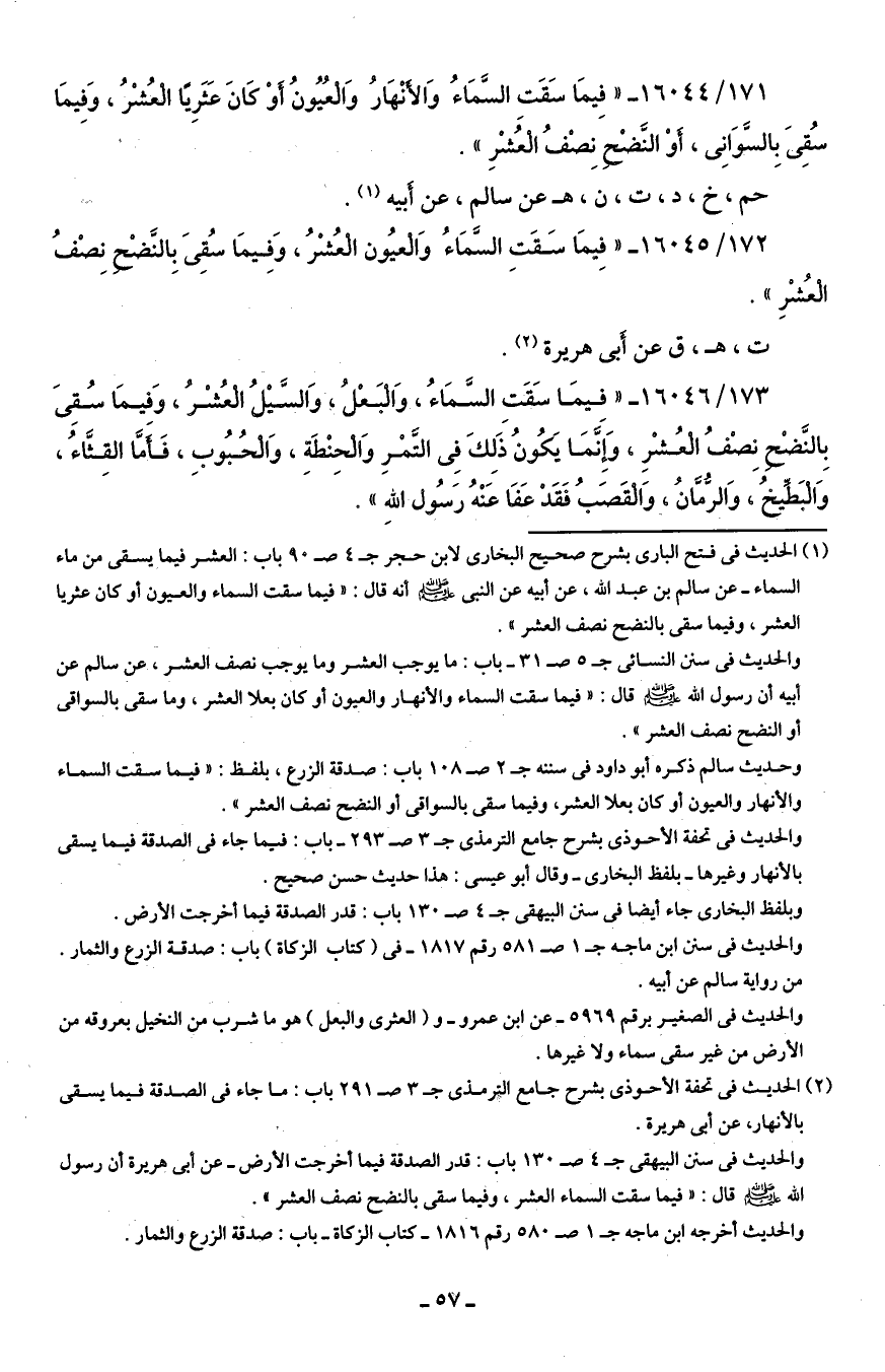 172/ 16045 - "فِيمَا سَقَت السَّمَاءُ وَالْعيُون الْعُشْرُ، وَفيمَا سُقِيَ بِالنَّضْحِ نِصْفُ الْعُشْرِ".