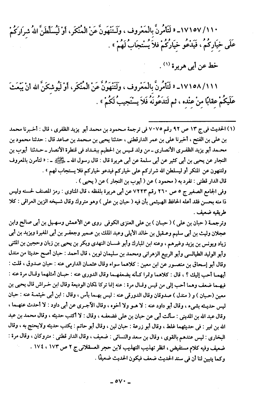 (¬1) الحديث في ج 13 ص 92 رقم 7075 في ترجمة محمود بن محمد أبو يزيد الظفرى، قال: أخبرنا محمد بن علي بن الفتح، أخبرنا علي بن عمر الدارقطني، حدثنا يحيى بن محمد بن صاعد قال: حدثنا محمود بن محمد أبو يزيد الظفرى الأنصاري -من ولد قيس بن الحطيم ببغداد في قنطرة الأنصار- حدثنا أيوب بن النجار عن يحيى بن أَبي كثير عن أَبي سلمة عن أَبي هريرة قال: قال رسول الله - صلى الله عليه وسلم -: "لتأمرن بالمعروف ولتنهون عن المنكر أو ليسلطن الله شراركم على خياركم فيدعو خياركم فلا يستجاب لهم".