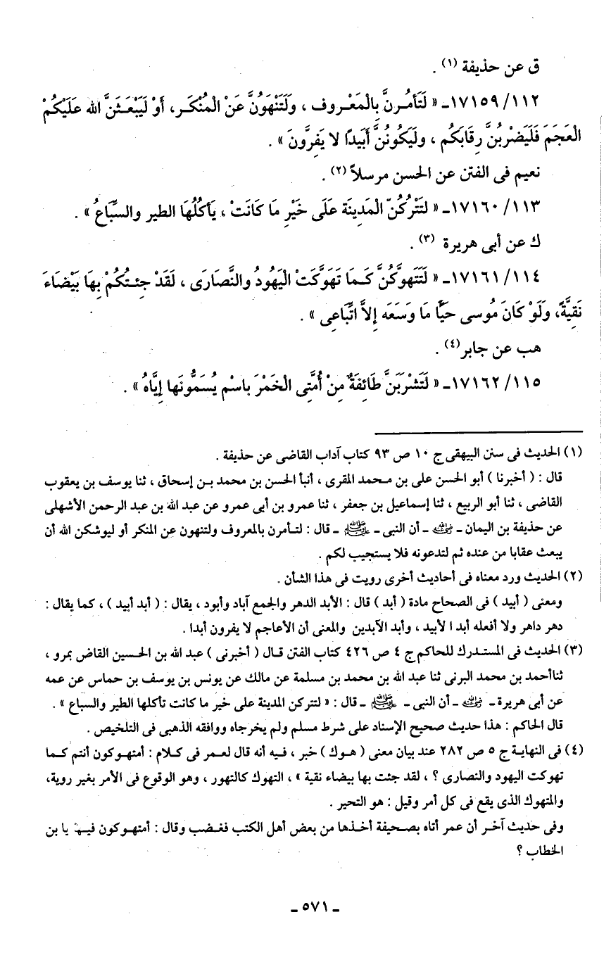 112/ 17159 - "لَتَأمُرنَّ بالمَعْروف، وَلَتَنْهَوُنَّ عَنْ المُنكر، أوْ لَيبْعَثَنَّ الله عَلَيكُمْ العَجَمَ فَلَيَضْربُنَّ رِقَابَكُم، ولَيَكُونُنَّ أبَيدًا لا يَفِرَّونَ".