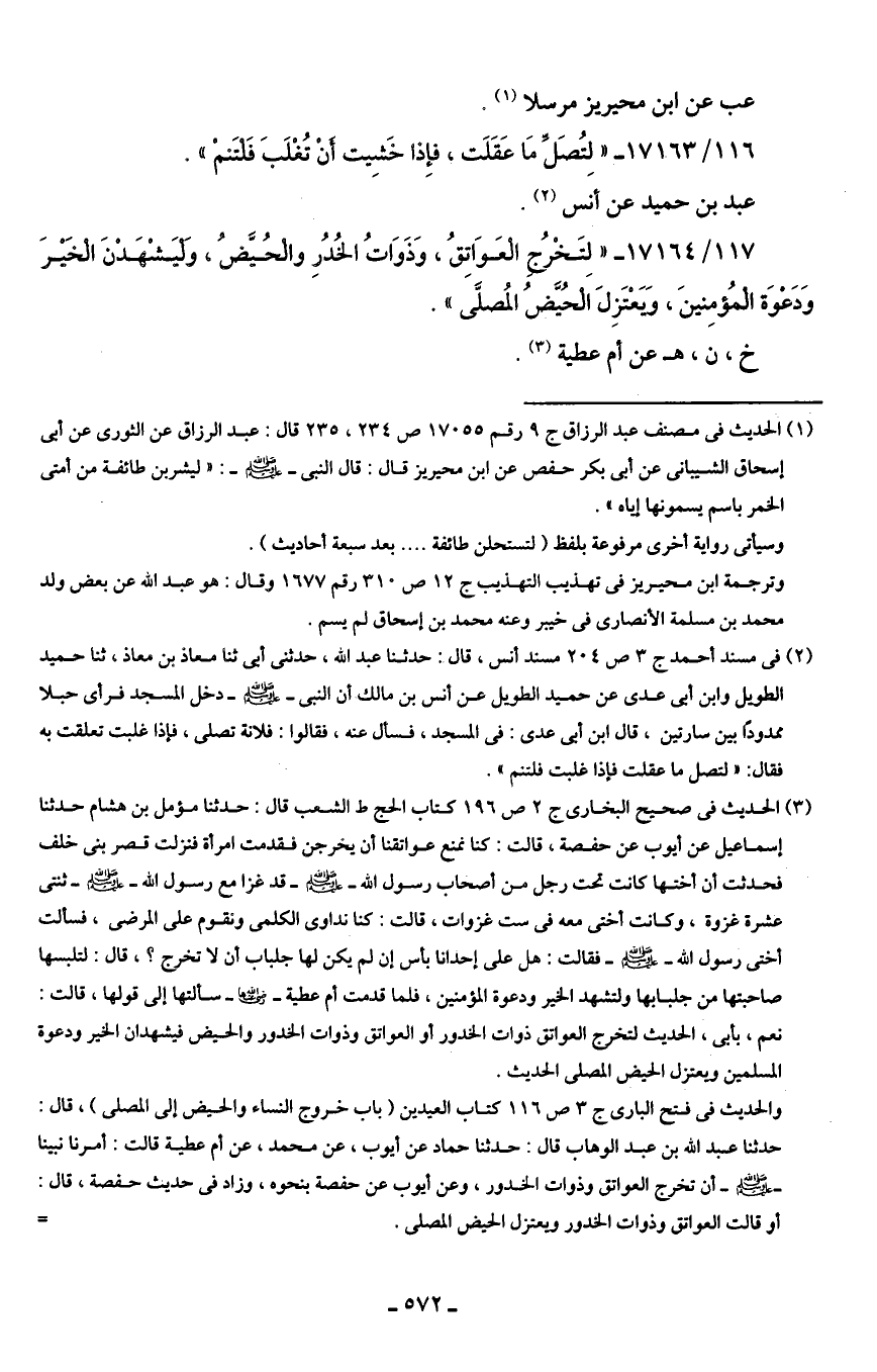 117/ 17164 - "لِتَخْرجُ العَوَاتِقُ، وَذَوَاتُ الخُدُرِ والحُيَّضْ، وَليَشْهدْنَ الخيرَ وَدَعْوَة المُؤمِنينَ، وَيَعْتَزِلَ الحُيَّضُ المُصلَّى".