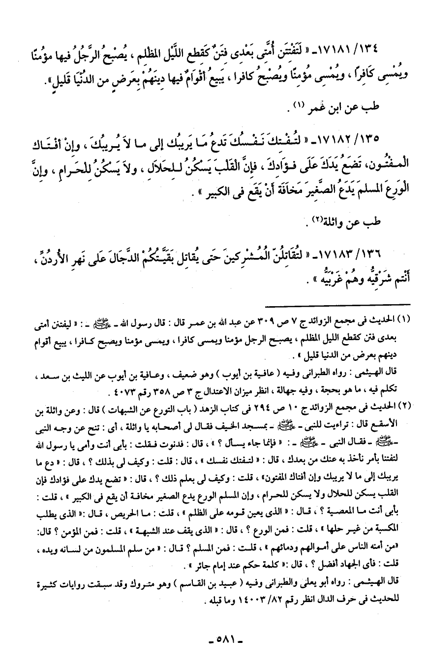 135/ 17182 - "لتُفْتِكَ نَفْسُكَ تَدع مَا يَريبُك إلى ما لَا يُريبكَ، وإن أفْتَاك المفْتُون، تَضَعُ يَدَكَ عَلَى فؤَادِكَ، فإِنَّ القَلبَ يَسكُنُ للحَلال، ولا يَسكنُ لِلحَرام، وإن الوَرِعَ المسلمَ يَدع الصَغِيرَ مَخافَة أنْ يَقَع في الكبير".