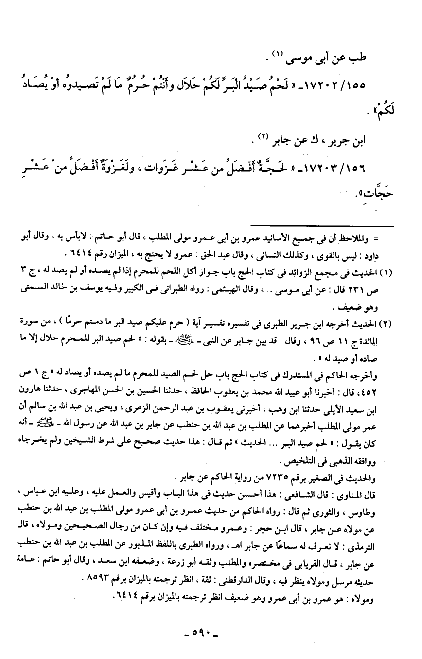 (¬2) الحديث أخرجه ابن جرير الطبري في تفسيره تفسير آية (حرم عليكم صيد البر ما دمتم حرمًا)، من سورة المائدة ج 11 ص 96، وقال: قد بين جابر عن النبي - صلى الله عليه وسلم - بقوله: "لحم صيد البر للمحرم حلال إلا ما صاده أو صيد له".