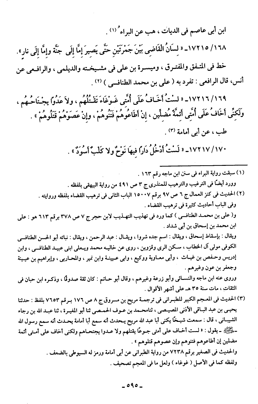 168/ 17215 - "لِسَانُ الْقَاضِي بَينَ جَمْرَتَينِ حَتَّى يَصِيرَ إِمَّا إِلَى جَنَّة وإِمَّا إِلَى نارٍ".