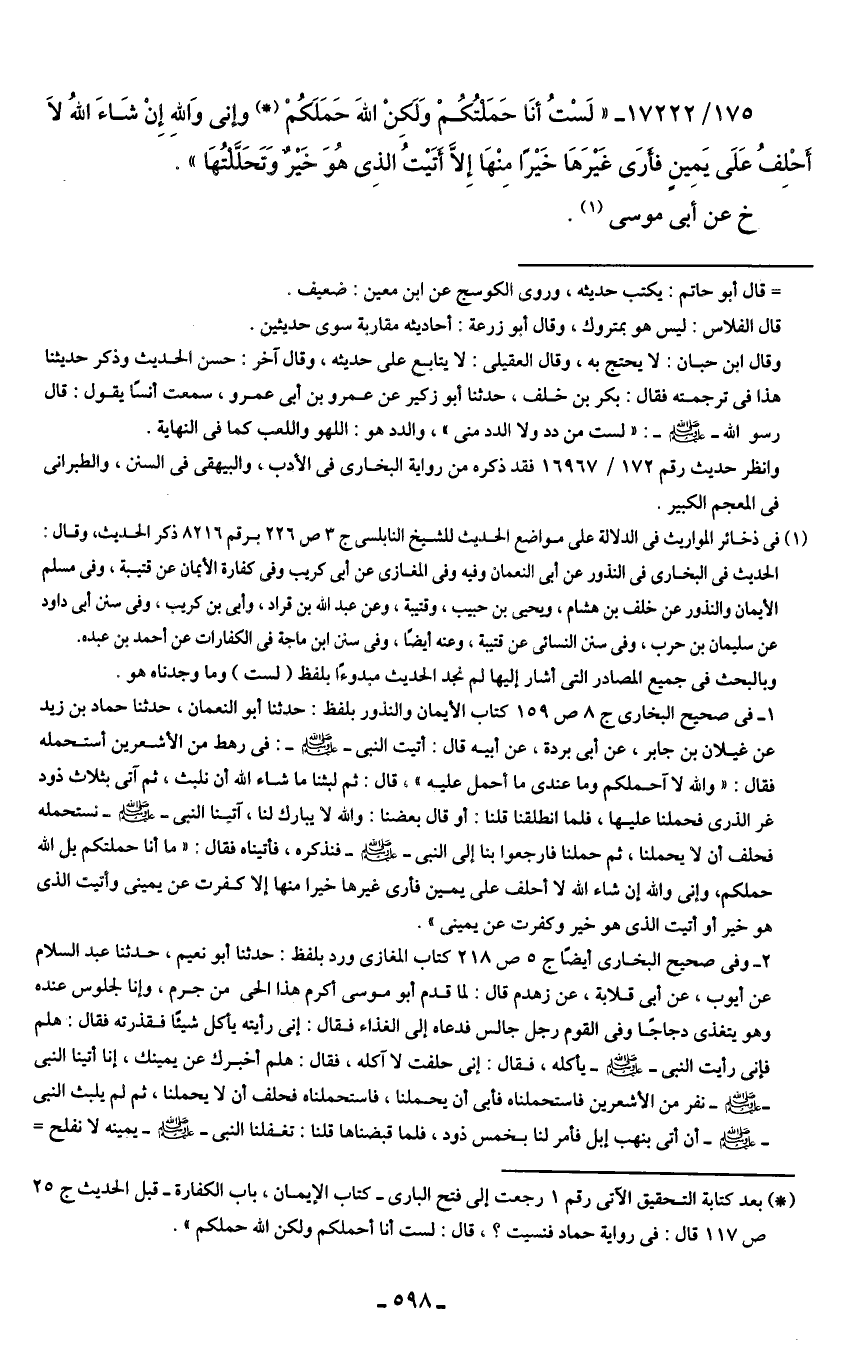 175/ 17222 - "لَسْتُ أنَا حَمَلتُكُمْ وَلَكِنْ اللهَ حَمَلَكُمْ (*) وإني وَالله إِنْ شَاءَ اللهُ لَا أحْلِفُ عَلَى يَمِينٍ فأَرَى غَيرَهَا خَيرًا مِنْهَا إِلَّا أتَيتُ الذِى هُوَ خيرٌ وَتَحَلَّلْتُها".