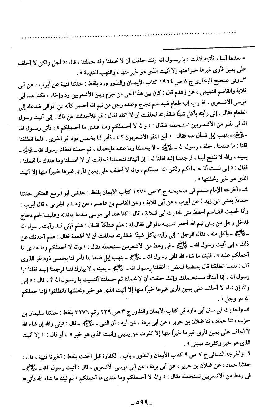 3 - وفي صحيح البخاري ج 8 ص 1964 كتاب الأيمان والنذور ورد بلفظ: حدثنا قتيبة عن أيوب، عن أبي قلابة والقاسم التميمى، عن زهدم قال: كان بين هذا الحى من جرم وبين الأشعريين ود وإخاء، فكنا عند أبي موسى الأشعرى، فقرب إليه طعام فيه لحم دجاج وعنده رجل من تيم الله أحمر كأنه من الموالى فدعاه إلى الطعام فقال: إني رأيته يأكل شيئًا فقذرته فحلفت أن لا آكله فقال: قم فلأحدثك عن ذاك: إني أتيت رسول الله في نفر من الأشعريين نستحمله فقال: "والله لا أحملكم وما عندي ما أحملكم"، فأتى رسول الله - صلى الله عليه وسلم - بنهب إبل فسأل عنه فقال: "أين النفر الأشعريون؟ "، فأمر لنا بخمس ذود غر الذرى، فلما انطلقنا قلنا: ما صنعنا، حلف رسول الله - صلى الله عليه وسلم - لا يحملنا وما عنده ما يحملنا، ثم حملنا تغفلنا رسول الله - صلى الله عليه وسلم - يمينه، والله لا نفلح أبدا، فرجعنا إليه فقلنا له: إن أتيناك لتحملنا فحلفت أن لا تحملنا وما عندك ما تحملنا، فقال: "إني لست أنا حملتكم ولكن الله حملكم، والله لا أحلف على يمين فأرى غيرها خيرًا منها إلا أتيت الذي هو خير وتحللتها".