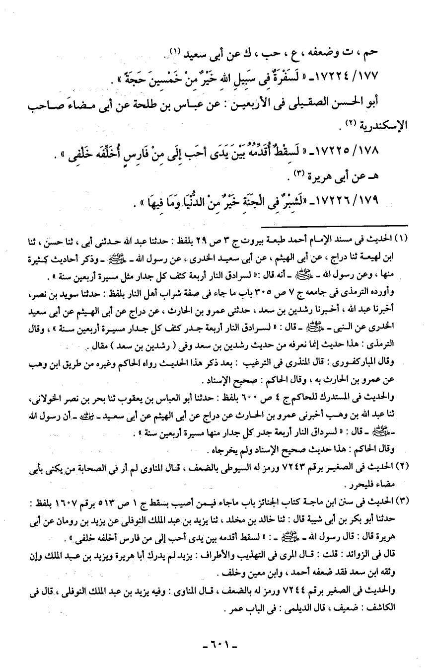 (¬1) الحديث في مسند الإمام أحمد طبعة بيروت ج 3 ص 29 بلفظ: حدثنا عبد الله حدثني أبي، ثنا حسن، ثنا ابن لهيعة ثنا دراج، عن أبي الهيثم، عن أبي سعيد الخدري، عن رسول الله - صلى الله عليه وسلم - وذكر أحاديث كثيرة منها، وعن رسول الله - صلى الله عليه وسلم - أنه - قال: "لسرادق النار أربعة كشف كل جدار مثل مسيرة أربعين سنة".