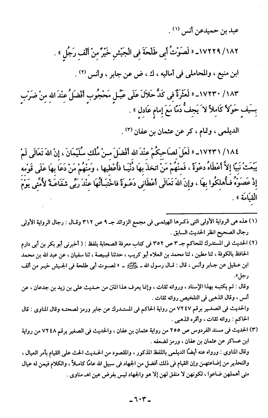 183/ 17230 - "لَعَثْرَةٌ فِي كَدٍّ حَلال عَلَى عَيِّلٍ مَحْجُوبٍ أفْضَلُ عِنْدَ اللهِ مِنْ ضَرْبٍ بِسَيفٍ حَوْلًا كَامِلًا لَا يَجِفُّ دَمًا مَعَ إِمامٍ عَادِلٍ".