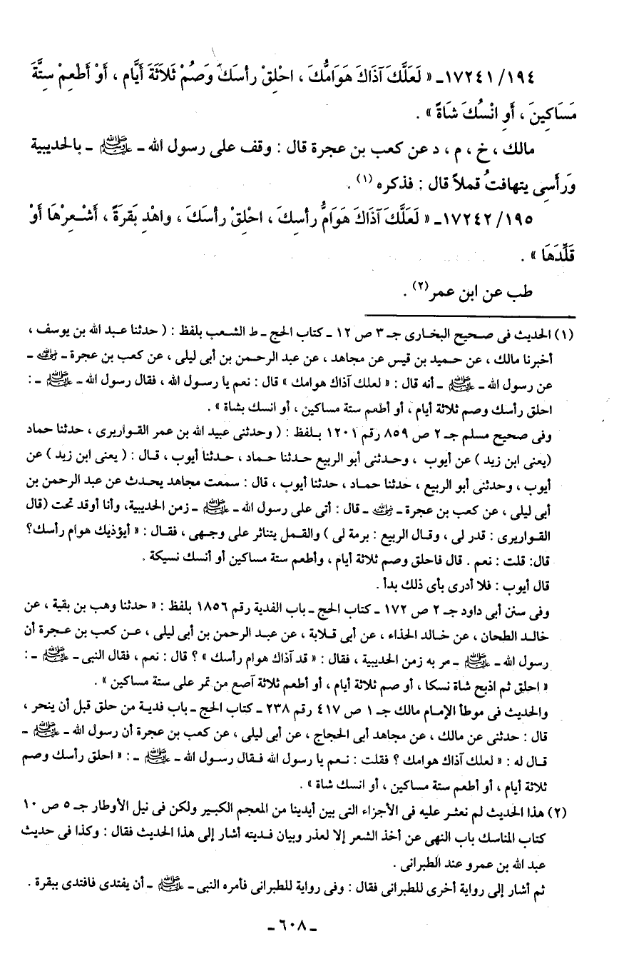 194/ 17241 - "لَعَلَّكَ آذَاكَ هَوَامُّكَ، احْلِقْ رأْسَكَ وَصُمْ ثَلاثَةَ أيَّام، أوْ أَطْعِمْ سِتَّةَ مَسَاكِينَ، أَو انْسُكَ شَاةً".