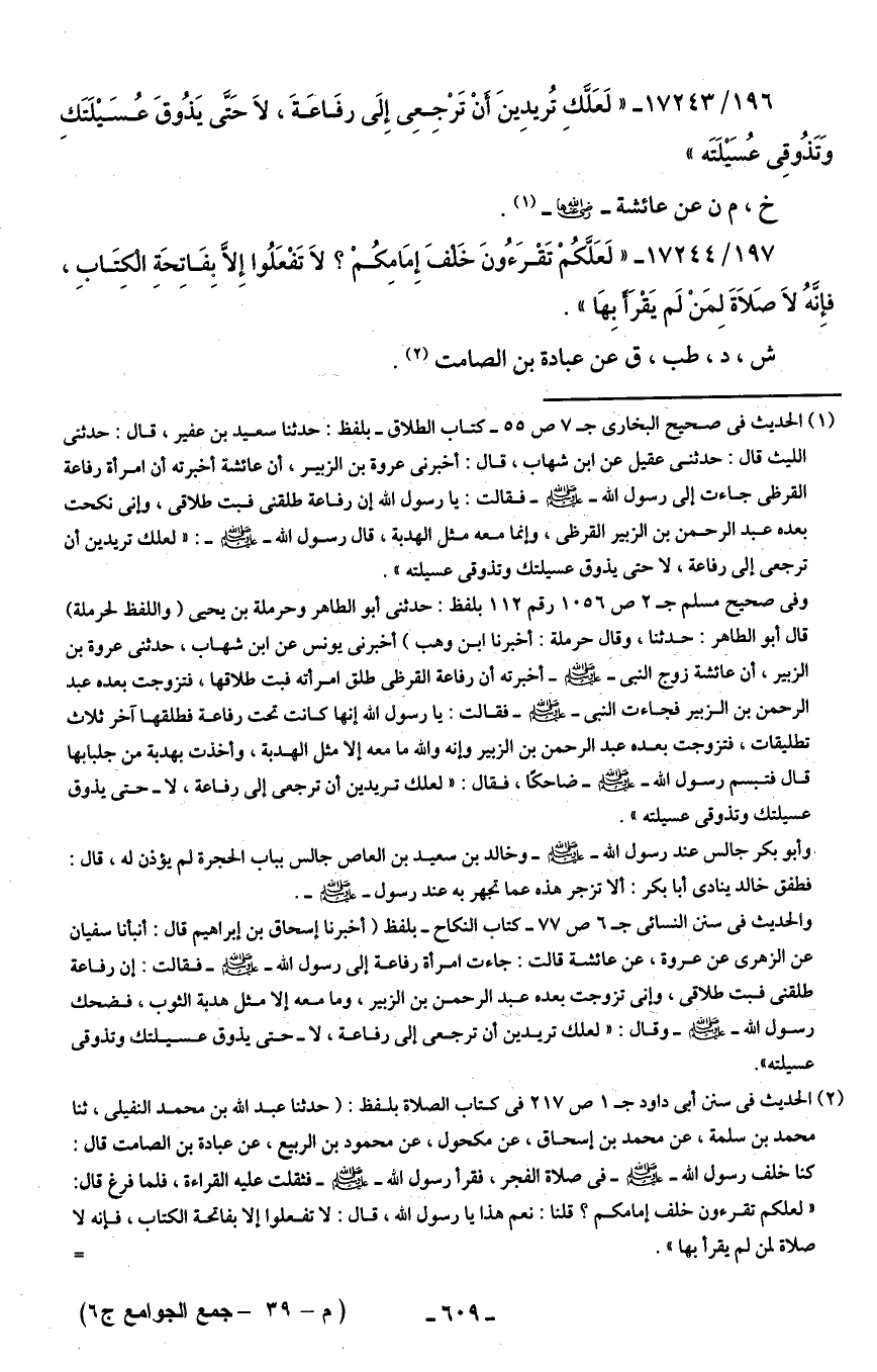 196/ 17243 - "لَعَلَّك تُريدينَ أَنْ تَرْجعِى إِلَى رفَاعَةَ، لَا حَتَّى يَذُوقَ عُسَيلَتَكِ وَتَذُوقِى عُسَيلَتَه".