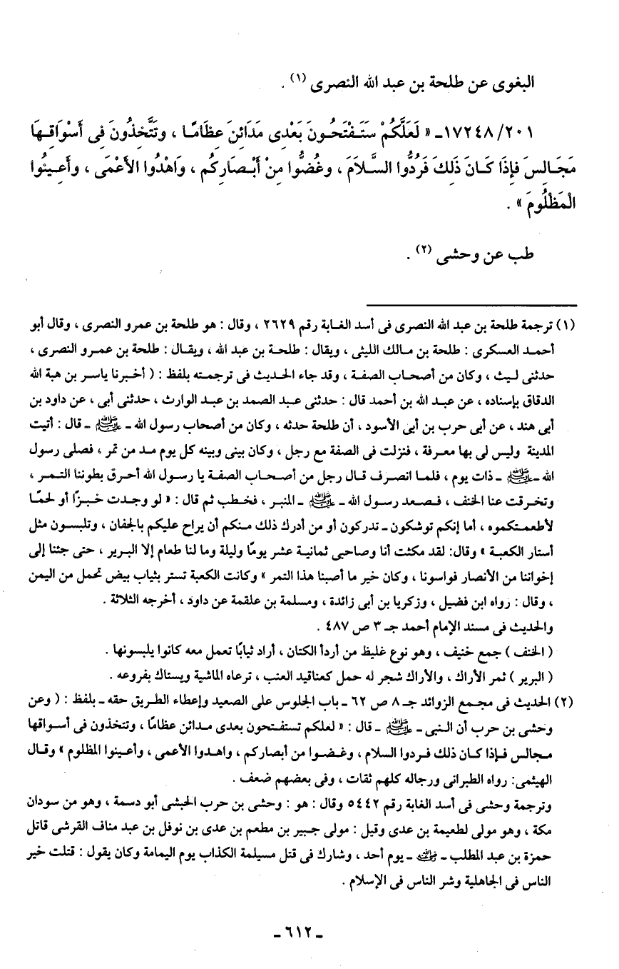 (¬1) ترجمة طلحة بن عبد الله النصرى في أسد الغابة رقم 2629، وقال: هو طلحة بن عمرو النصرى، وقال أبو أحمد العسكرى: طلحة بن مالك الليثى، ويقال: طلحة بن عبد الله، ويقال: طلحة بن عمرو النصرى، حدثني ليث، وكان من أصحاب الصفة، وقد جاء الحديث في ترجمته بلفظ: (أخبرنا ياسر بن هبة الله الدقاق بإسناده، عن عبد الله بن أحمد قال: حدثني عبد الصمد بن عبد الوارث، حدثني أبي، عن داود بن أبي هند، عن أبي حرب بن أبي الأسود، أن طلحة حدثه، وكان من أصحاب رسول الله - صلى الله عليه وسلم - قال: أتيت المدينة وليس لي بها معرفة، فنزلت في الصفة مع رجل، وكان بيني وبينه كل يوم مد من تمر، فصلى رسول الله - صلى الله عليه وسلم - ذات يوم، فلما انصرف قال رجل من أصحاب الصفة يا رسول الله أحرق بطوننا التمر، وتخرقت عنا الخنف، فصعد رسول الله - صلى الله عليه وسلم - المنبر، فخطب ثم قال: "لو وجدت خبزًا أو لحمًا لأطعمتكموه، أما إنكم توشكون - تدركون أو من أدرك ذلك منكم أن يراح عليكم بالجفان، وتلبسون مثل أستار الكعبة" وقال: لقد مكثت أنا وصاحبى ثمانية عشر يومًا وليلة وما لنا طعام إلا البرير، حتى جئنا إلى إخواننا من الأنصار فواسونا، وكان خير ما أصبنا هذا التمر" وكانت الكعبة تستر بثياب بيض تحمل من اليمن، وقال: رواه ابن فضيل، وزكريا بن أبي زائدة، ومسلمة بن علقمة عن داود، أخرجه الثلاثة.