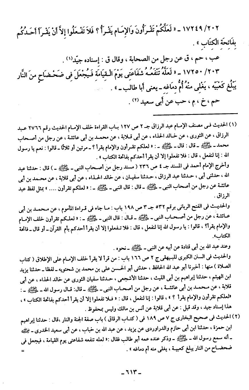 202/ 17249 - "لَعَلَّكُمْ تَقْرَأُونَ وَالإِمَام يَقْرَأُ؟ فَلَا تَفْعَلُوا إِلَّا أنْ يَقْرَأَ أحَدُكُم بِفَاتِحَةِ الْكِتَابِ".