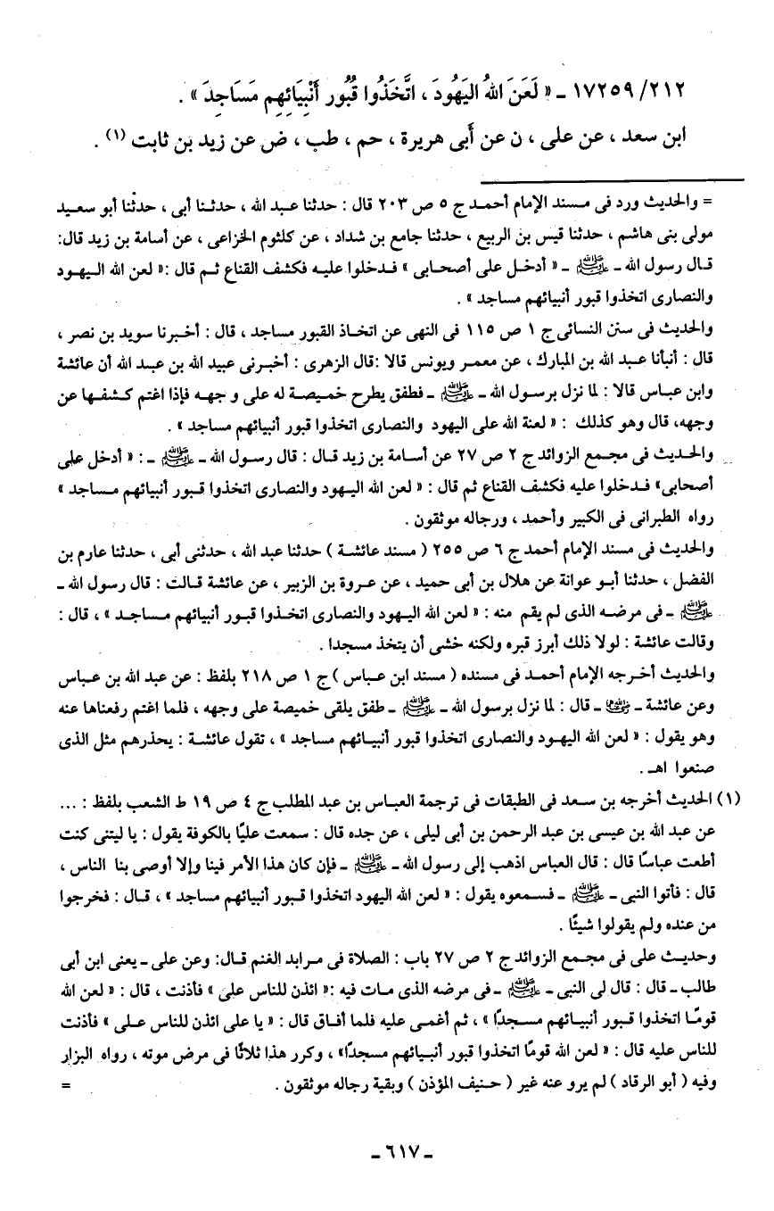 212/ 17259 - "لَعَنَ اللهُ اليَهُودَ، اتَّخَذُوا قُبُور أنْبِيَائِهِم مَسَاجِدَ".