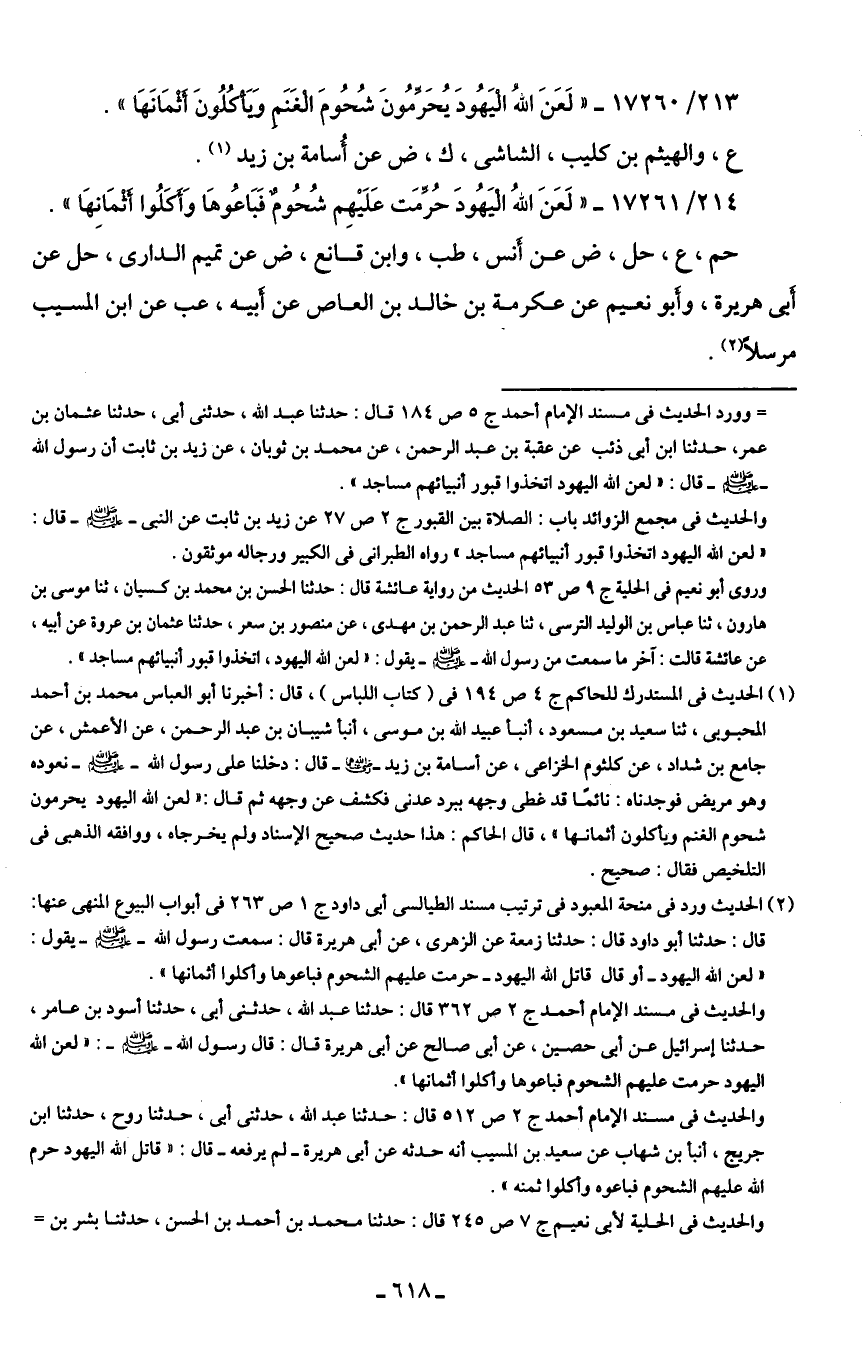 213/ 17260 - "لَعَنَ الله الْيَهُودَ يُحَرِّمُونَ شُحُومَ الْغَنَمِ وَيَأكُلُونَ أثْمَانَهَا".