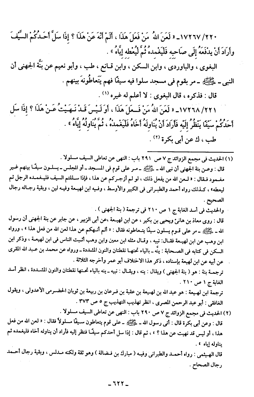 221/ 17268 - "لَعَنَ اللهُ مَنْ فَعَلَ هَذَا، أوَ لَيسَ قَدْ نَهيتُ عَن هَذَا؟ إِذَا سَل أحَدُكُمْ سَيفًا يَنْظُرُ إِلَيهِ فَأرَادَ أنْ يُنَاولَهُ أخَاهُ فَليَغْمِدْهُ، ثُمَّ يُنَاولُهُ إِيَّاهُ".