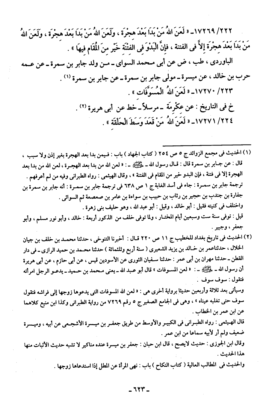 222/ 17269 - "لَعَنَ اللهُ مَن بَدَا بَعْدَ هِجْرَة، وَلَعَنَ اللهُ مَنْ بَدَا بَعْدَ هِجْرَة، وَلَعَنَ اللهُ مَنْ بَدَا بَعْدَ هِجْرَة إلا في الفتنة، فإِنَّ الْبَدْوَ فِي الفِتْنَةِ خَير مِنَ المُقَام فِيهَا".
