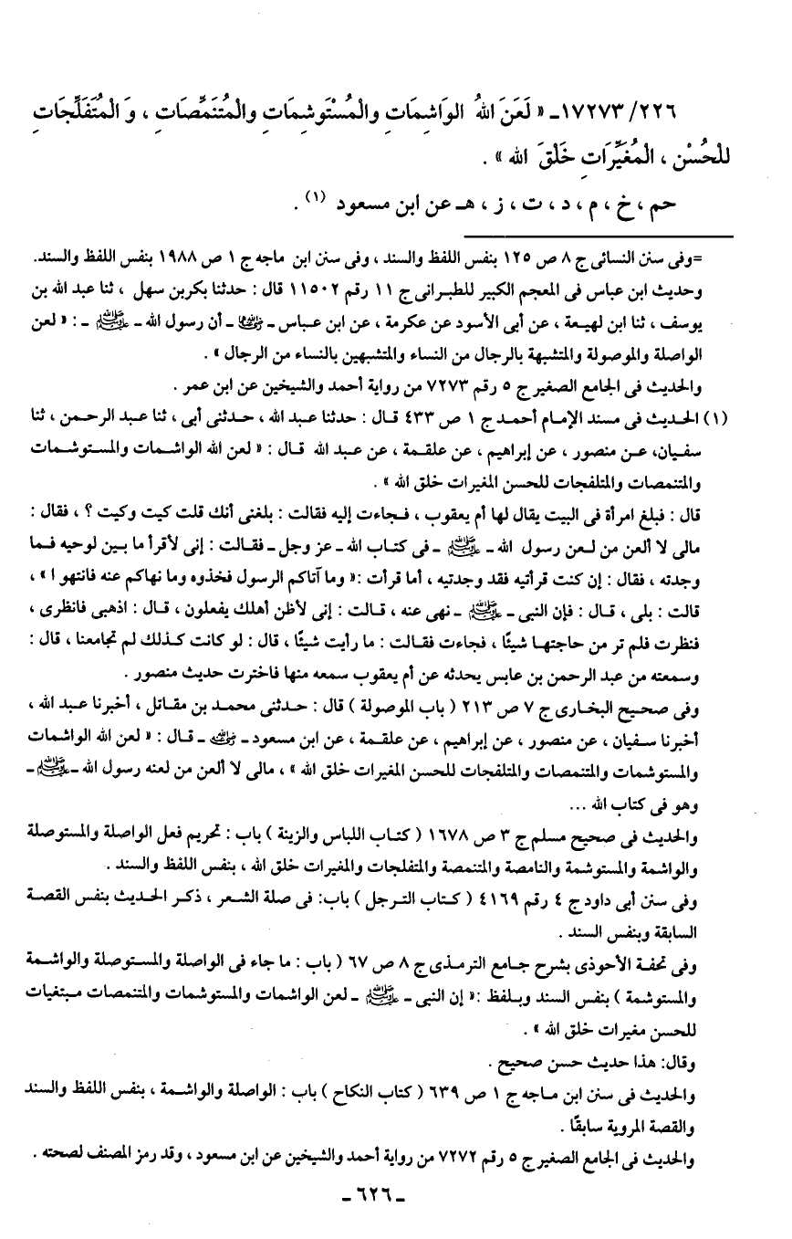 226/ 17273 - "لَعَنَ اللهُ الوَاشِمَاتِ والْمُسْتَوشِمَاتِ والمُتنَمِّصَاتِ، وَالْمُتَفَلِّجَاتِ للحُسْن، الْمُغَيِّرَاتِ خَلقَ الله".