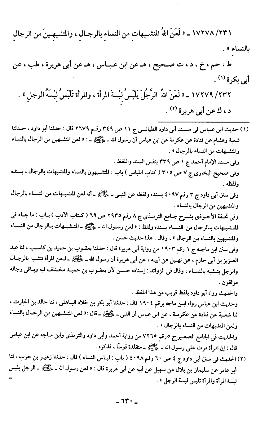 232/ 17279 - "لَعَنَ اللهُ الرَّجُلَ يَلبَسُ لِبْسةَ المرأة، والمرأَة تَلبَسُ لِبسَهُ الرجلِ".