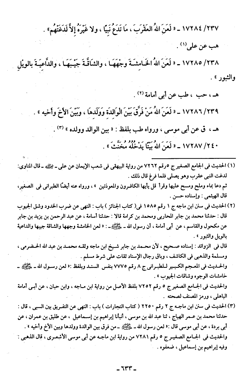 238/ 17285 - "لَعَنَ اللهُ الخَامِشَةَ وجْهَهَا، والشَاقَّةَ جَيبَهَا، والدَّاعِيَةَ بالويلِ والثبور".