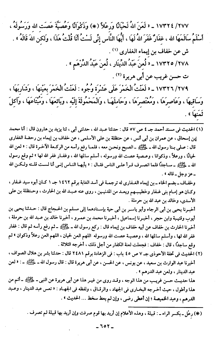 (¬1) الحديث في مسند أحمد ج 4 ص 57 قال: حدثنا عبد الله، حدثني أبي، ثنا يزيد بن هارون قال: أنا محمد بن إسحاق، عن عمران بن أبي أنس، عن حنظلة بن علي الأسلمي، عن خفاف بن إيماء بن رحضة الغفارى قال: صلى بنا رسول الله - صلى الله عليه وسلم - الصبح ونحن معه، فلما رفع رأسه من الركعة الآخرة قال: "لعن الله لحيانًا، ورعلًا، وذكوانا، وعصية عصت الله ورسوله، أسلم سالمها الله، وغفار غفر الله لها " ثم وقع رسول الله - صلى الله عليه وسلم - ساجدًا فلما انصرف قرأ على الناس فقال: "يأيها الناس إني أنا لست قلته ولكن الله -عزَّ وجلَّ- قاله".