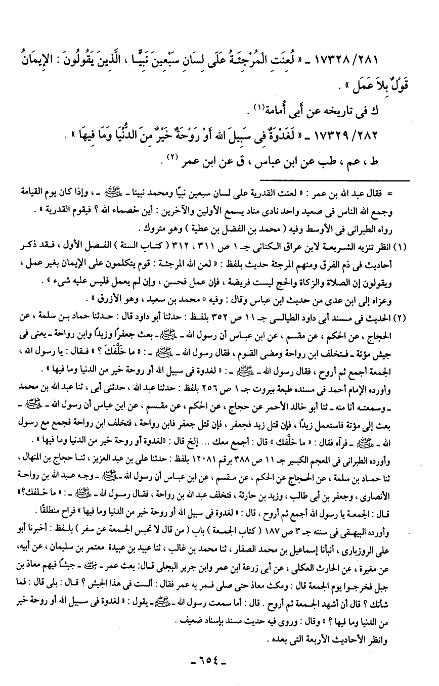 281/ 17328 - "لُعِنَتِ الْمُرْجِئَةُ عَلَى لِسَانِ سَبْعِينَ نَبِيًّا، الَّذِينَ يَقولُونَ: الإِيمَانُ قَوْلٌ بِلا عَمَل".