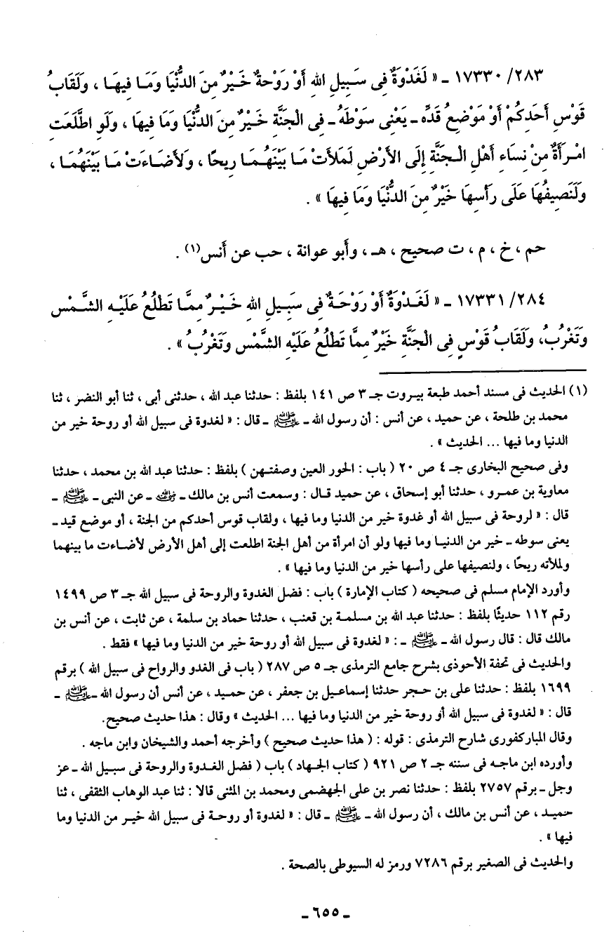 284/ 17331 - "لَغَدْوَةٌ أوْ رَوْحَةٌ فِي سَبِيلِ اللهِ خيرٌ مِمَّا تَطلُعُ عَلَيهِ الشَّمْس وَتَغْرُبُ، وَلَقَابُ قَوْسٍ فِي الْجَنَّةِ خَيرٌ مِمَّا تَطلُعُ عَلَيهِ الشمْس وَتَغْرُبُ".