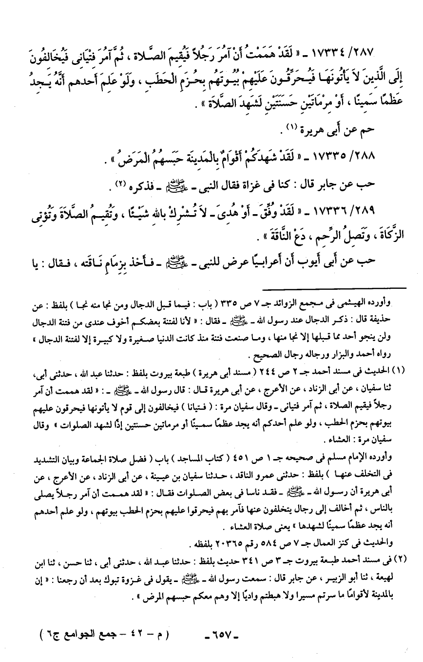 287/ 17334 - "لَقَدْ هَمَمْتُ أنْ آمُرَ رَجُلًا ليُقِيمَ الصَّلاة، ثُمَّ آمُرَ فتيَانِى فَيُخَالِفُونَ إِلَى الَّذِينَ لَا يَأتُونَهَا فَيُحَرِّقُونَ عَلَيهِمْ بُيُوتَهُم بِحُزَمِ الْحَطَبِ، وَلَوْ عَلمَ أحَدهم أَنَّهُ يَجِدُ عَظْمًا سَمِينًا، أَوْ مِرْمَاتَينِ حَسَنَتَينِ لَشَهِدَ الصَّلاة".