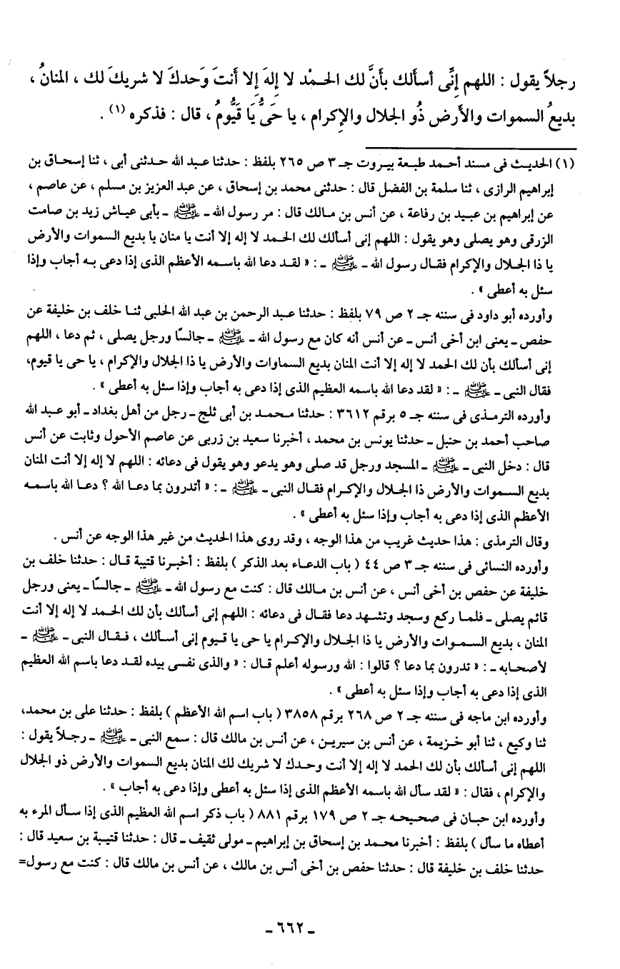 (¬1) الحديث في مسند أحمد طبعة بيروت ج 3 ص 265 بلفظ: حدثنا عبد الله حدثني أبي، ثنا إسحاق بن إبراهيم الرازي، ثنا سلمة بن الفضل قال: حدثني محمد بن إسحاق، عن عبد العزيز بن مسلم، عن عاصم، عن إبراهيم بن عبيد بن رفاعة، عن أنس بن مالك قال: مر رسول الله - صلى الله عليه وسلم - بأبي عياش زيد بن صامت الزرقى وهو يصلى وهو يقول: اللهم إني أسألك لك الحمد لا إله إلا أنت يا منان يا بديع السموات والأرض يا ذا الجلال والإكرام فقال رسول الله - صلى الله عليه وسلم -: "لقد دعا الله باسمه الأعظم الذي إذا دعى به أجاب وإذا سئل به أعطى".