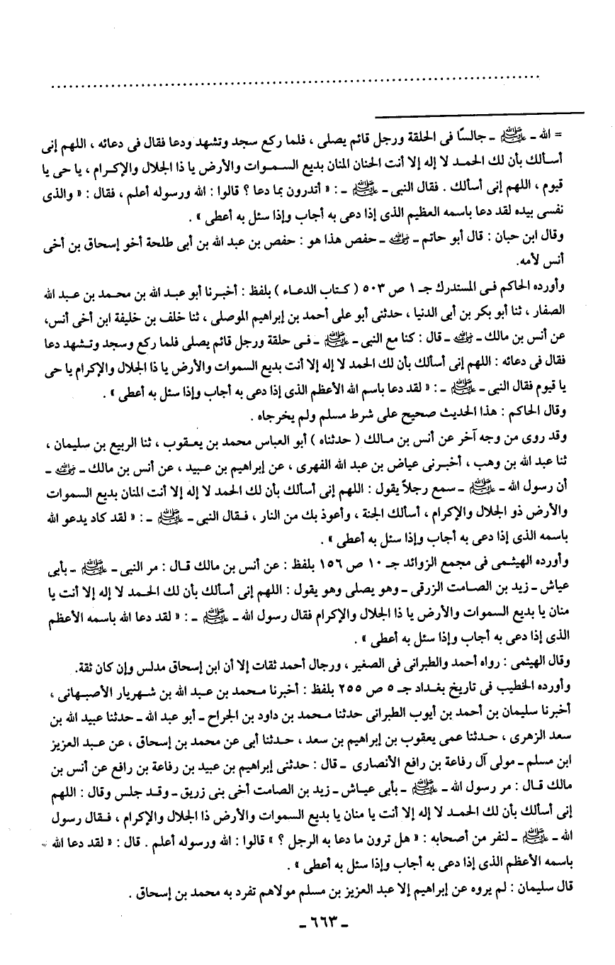 وأورده الحاكم في المستدرك ج 1 ص 503 (كتاب الدعاء) بلفظ: أخبرنا أبو عبد الله بن محمد بن عبد الله الصفار، ثنا أبو بكر بن أبي الدنيا، حدثني أبو على أحمد بن إبراهيم الموصلى، ثنا خلف بن خليفة ابن أخي أنس، عن أنس بن مالك - رضي الله عنه - قال: كنا مع النبي - صلى الله عليه وسلم - في حلقة ورجل قائم يصلى فلما ركع وسجد وتشهد دعا فقال في دعائه: اللهم إني أسألك بالله لك الحمد لا إله إلا أنت بديع السموات والأرض يا ذا الجلال والإكرام يا حي يا قيوم فقال النبي - صلى الله عليه وسلم -: "لقد دعا باسم الله الأعظم الذي إذا دعى به أجاب وإذا سئل به أعطى".