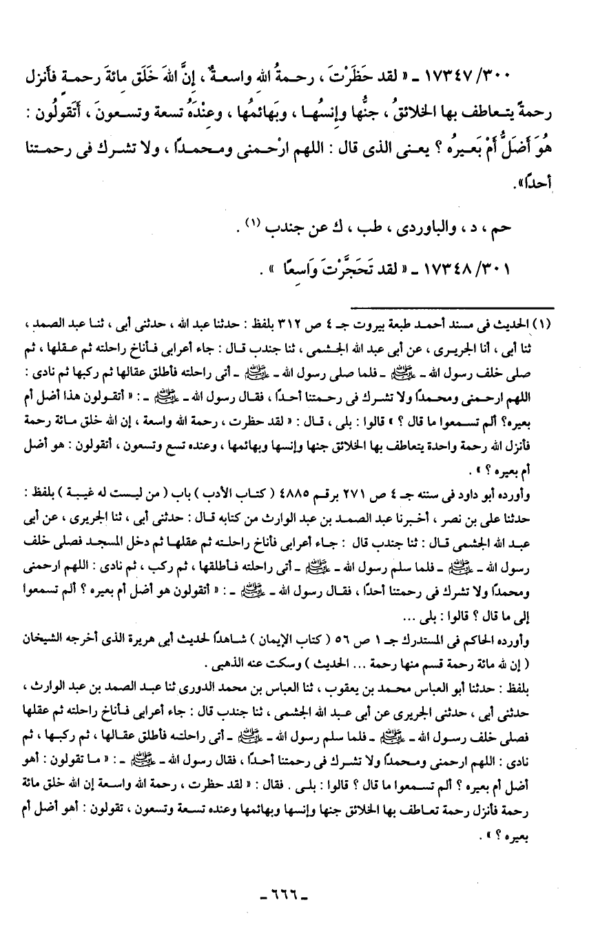 (¬1) الحديث في مسند أحمد طبعة بيروت ج 4 ص 312 بلفظ: حدثنا عبد الله، حدثني أبي، ثنا عبد الصمد، ثنا أبي، أنا الجريرى، عن أبي عبد الله الجشمى، ثنا جندب قال: جاء أعرابى فأناخ راحلته فم عقلها، ثم صلى خلف رسول الله - صلى الله عليه وسلم - فلما صلى رسول الله - صلى الله عليه وسلم - أتى راحلته فأطلق عقالها ثم ركبها ثم نادى: اللهم ارحمنى ومحمدًا ولا تشرك في رحمتنا أحدًا، فقال رسول الله - صلى الله عليه وسلم -: "أتقولون هذا أضل أم بعيره؟ ألم تسمعوا ما قال؟ " قالوا: بلى، قال: "لقد حظرت، رحمة الله واسعة، إن الله خلق مائة رحمة فأنزل الله رحمة واحدة يتعاطف بها الخلائق جنها وإنسها وبهائمها، وعنده تسع وتسعون، أتقولون: هو أضل أم بعيره؟ ".