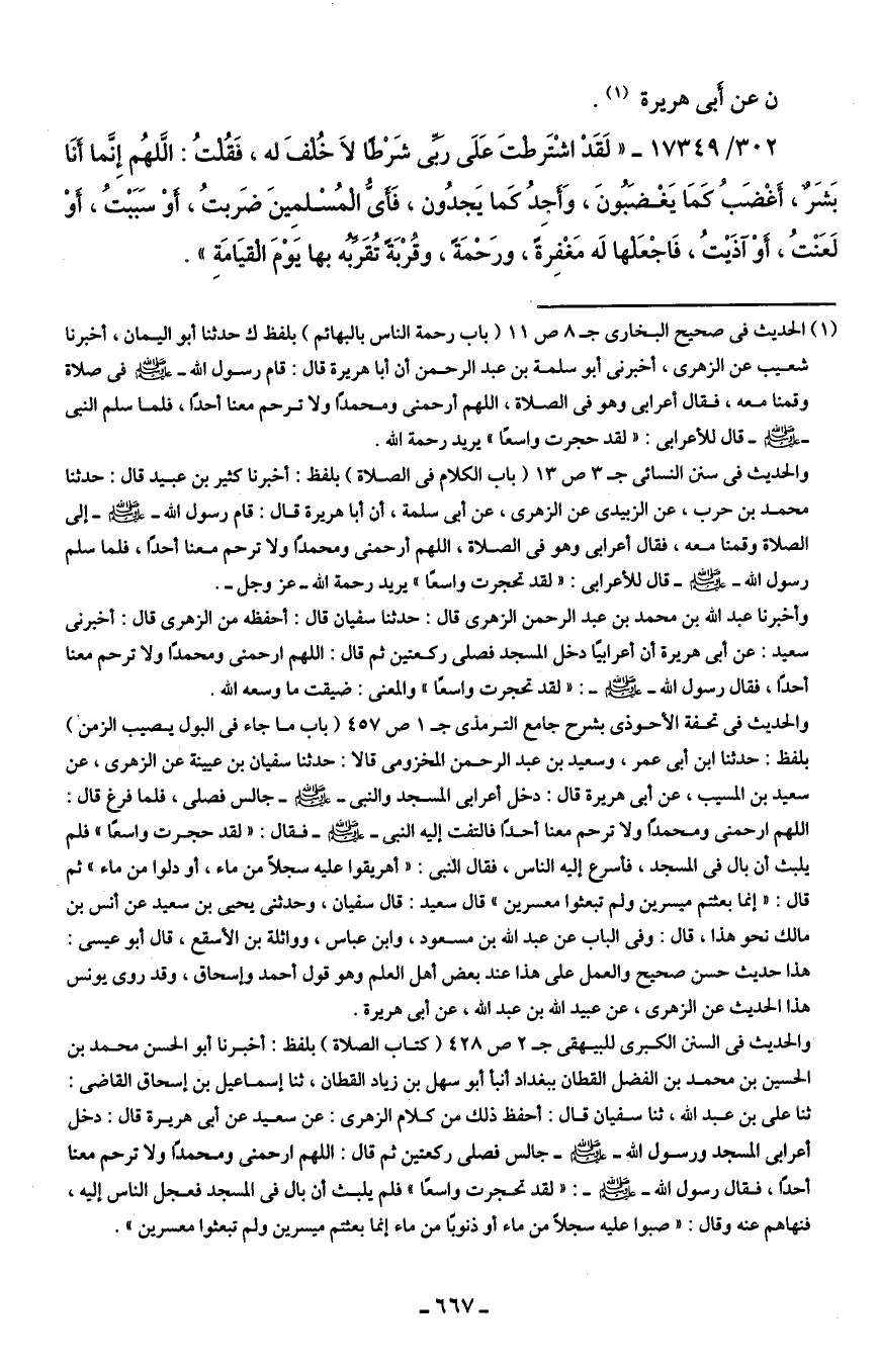 (¬1) الحديث في صحيح البخاري ج 8 ص 11 (باب رحمة الناس بالبهائم) بلفظ ك حدثنا أبو اليمان، أخبرنا شعيب عن الزهري، أخبرني أبو سلمة بن عبد الرحمن أن أبا هريرة قال: قام رسول الله - صلى الله عليه وسلم - في صلاة وقمنا معه، فقال أعرابى وهو في الصلاة، اللهم أرحمنى ومحمدًا ولا ترحم معنا أحدًا، فلما سلم النبي - صلى الله عليه وسلم - قال للأعرابى: "لقد حجرت واسعًا" يريد رحمة الله.