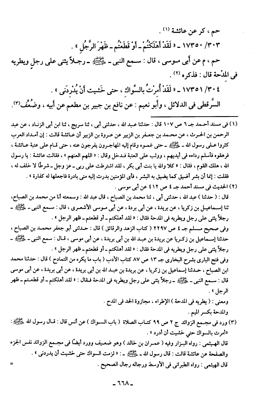 وفي صحيح مسلم ج 4 ص 2297 (كتاب الزهد والرقائق) قال: حدثني أبو جعفر محمد بن الصباح، حدثنا إسماعيل بن زكريا عن بريدة بن عبد الله بن أبي بريدة، عن أبي موسى، قال: سمع النبي - صلى الله عليه وسلم - رجلًا يثنى على رجل ويطريه في المدحة فقال: "لقد أهلكتم -أو قطعتم- ظهر الرجل".